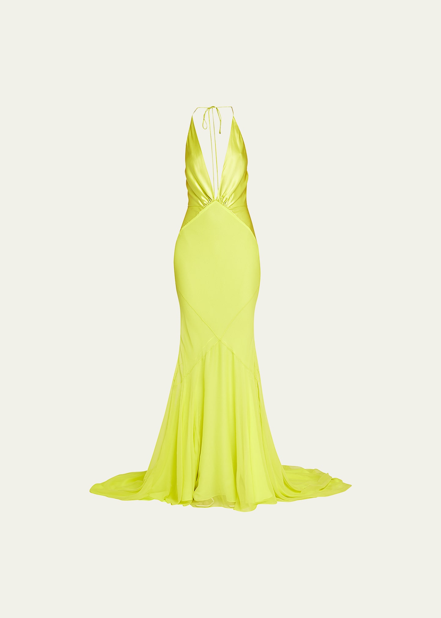 CHRISTOPHER JOHN ROGERS satin gown Deep V halter neckline; self-tie at nape Sleeveless Bias-cut silhouette Hem pools floor Silk Dry clean Made in USA