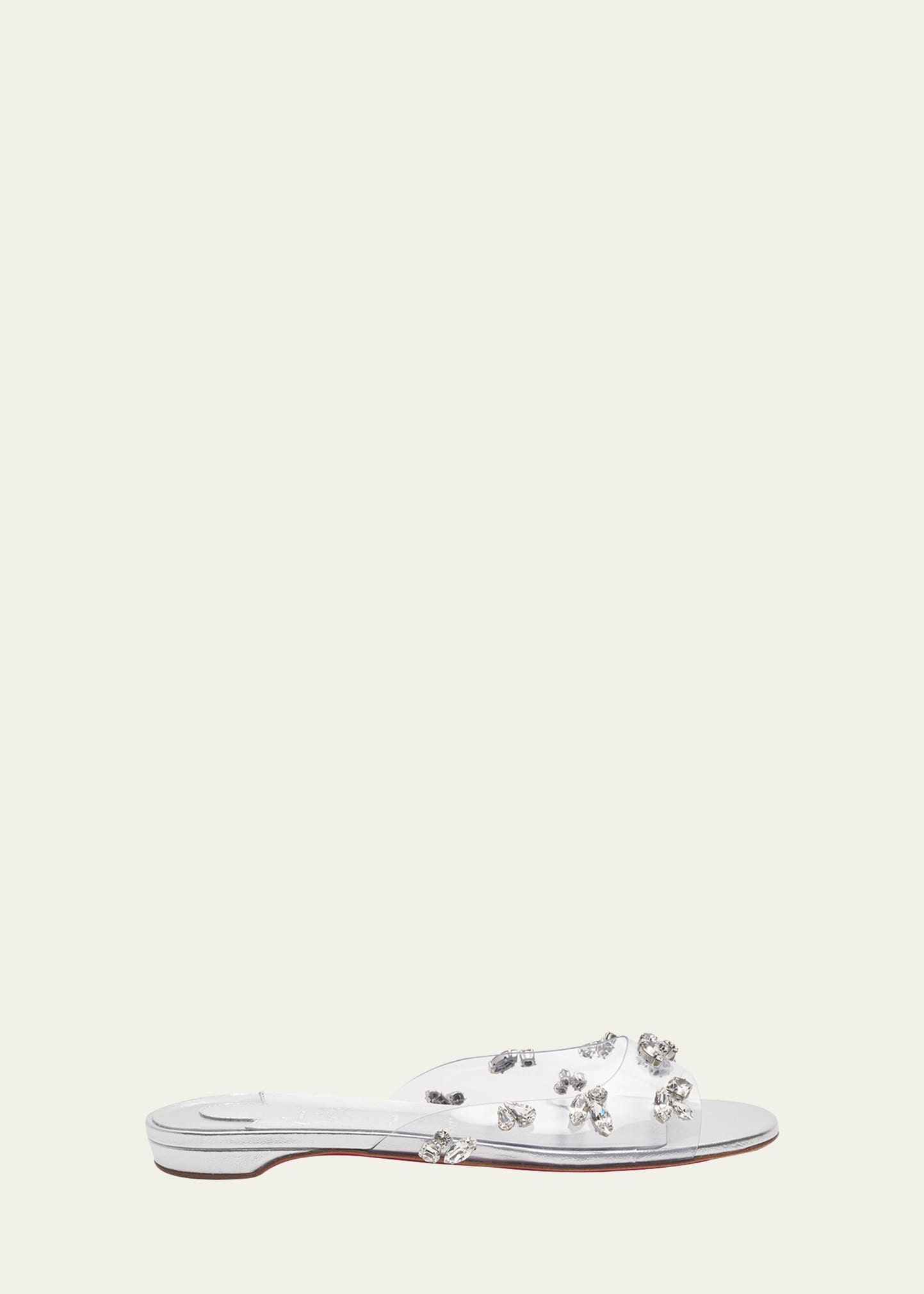 Christian Louboutin "Degraqueenie" crystal embellished clear PVC sandals Flat heel Open toe Wide band upper Slide style Signature Louboutin red leather outsole Made in Italy