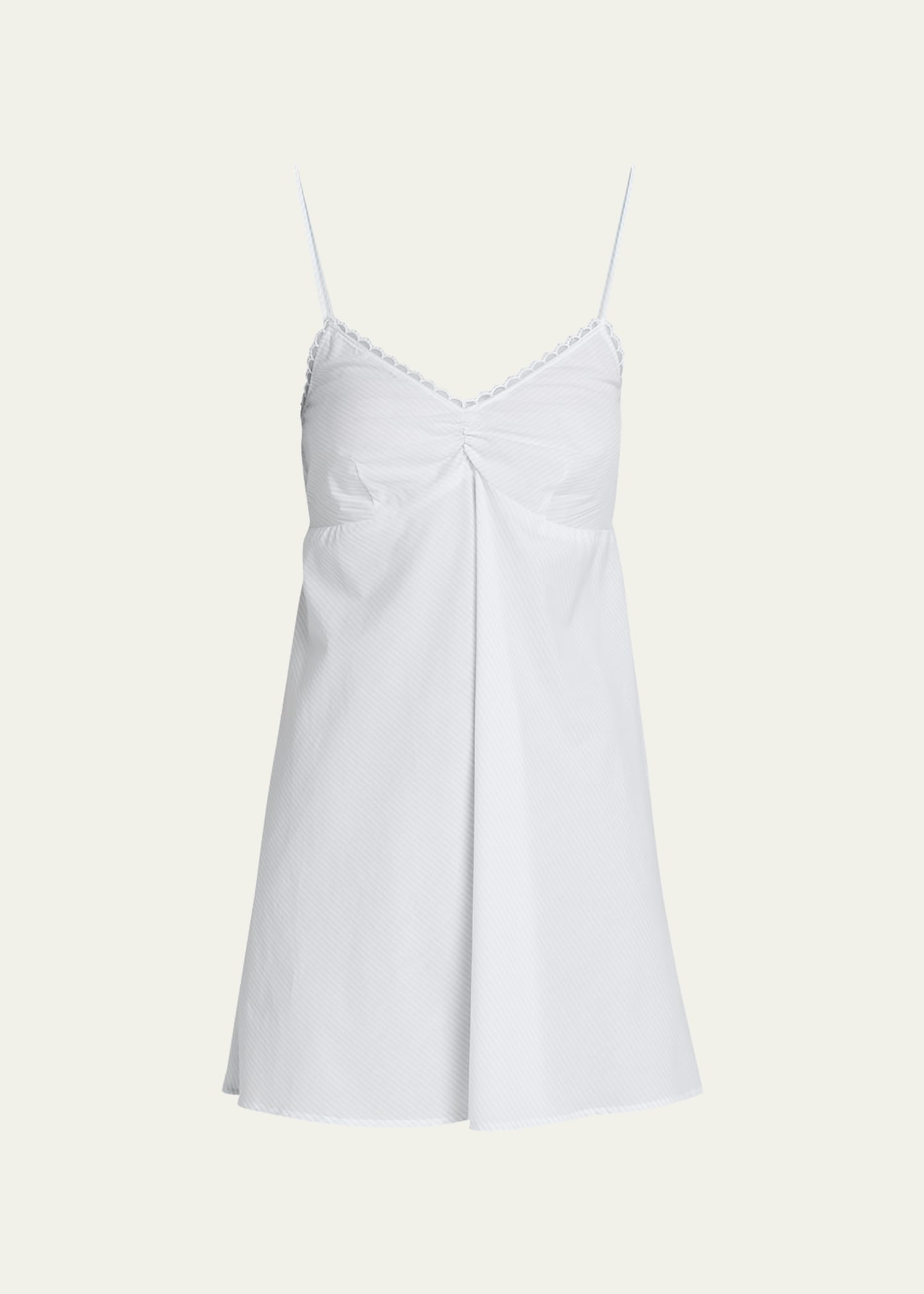 Andine "Delilah" striped chemise with ruching at the bust and scalloped lace trim V neckline Sleeveless Empire waist Hem falls at mid-thigh A-line silhouette Slipover style Supima® cotton Machine wash cold Made in the USA