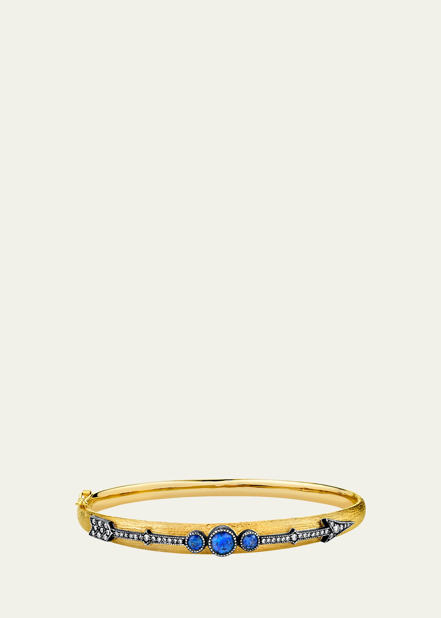 Arman Sarkisyan bangle with an arrow motif 18-karat gold with a textured finish Stones set in oxidized silver Diamonds and blue sapphires 0.91 total diamond carat weight 0.32 total sapphire carat weight Hinged opening eases dress Made in USA