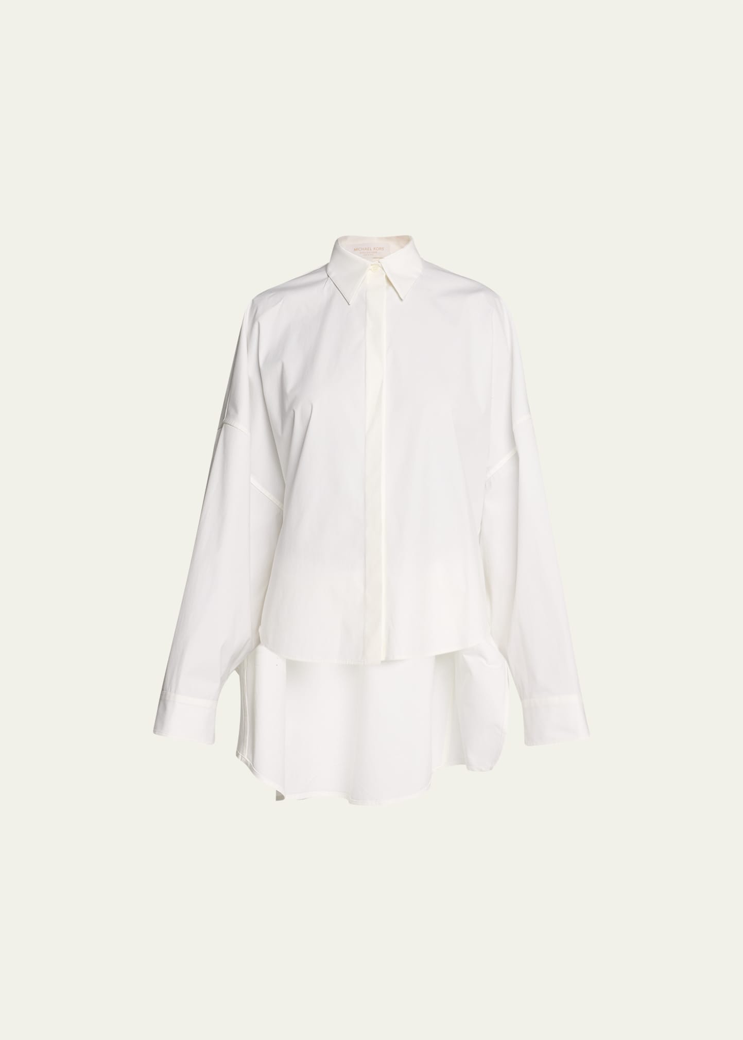 Michael Kors Collection poplin shirt Spread collar; covered button placket Long dolman sleeves; button cuffs Relaxed fit High-low hem Cotton Dry clean Made in Italy