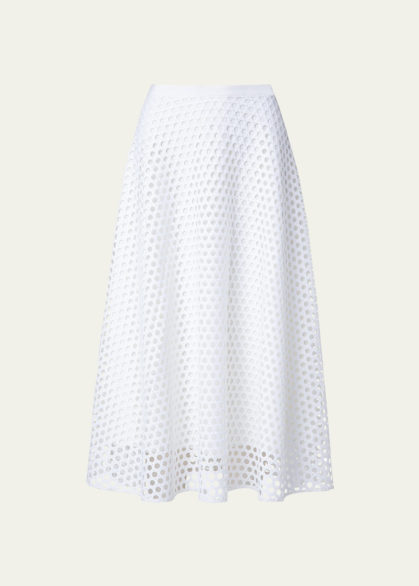 Akris punto midi skirt in a dotted mesh guipure styling High rise; banded waist Back zip closure Hem falls below the knee Circle-cut silhouette Polyester Made in Romania