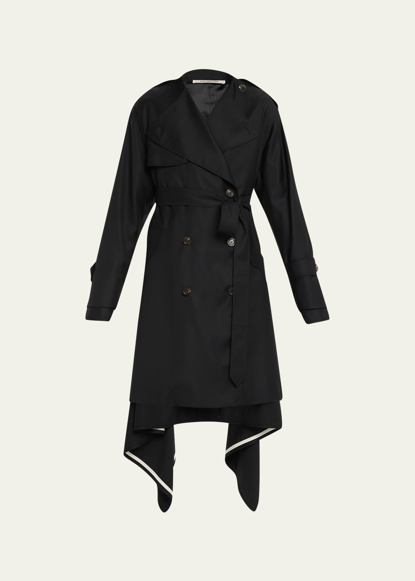 Peter Do trench coat with signature tattoo line Double-breasted neckline Long sleeves; belted cuffs Side slip pockets Gun flap; back storm flap Mid-calf length Handkerchief hem Virgin wool/viscose/acetate Made in Italy