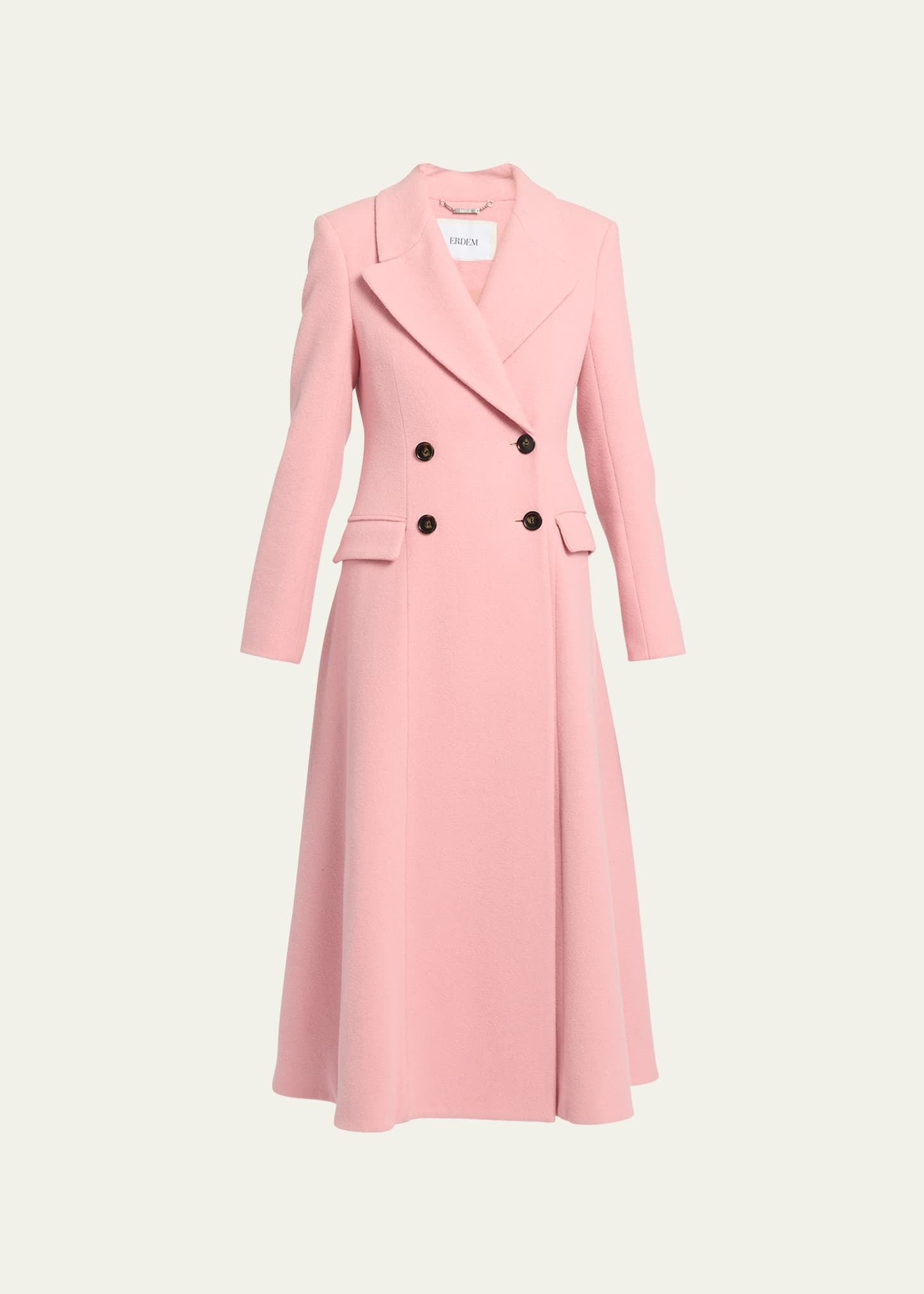 Erdem double-breasted coat Peak lapels Long sleeves; button cuffs Hip flap pockets Flared silhouette Longline Wool/cashmere Silk lining Dry clean, professional cleaning recommended Made in Romania