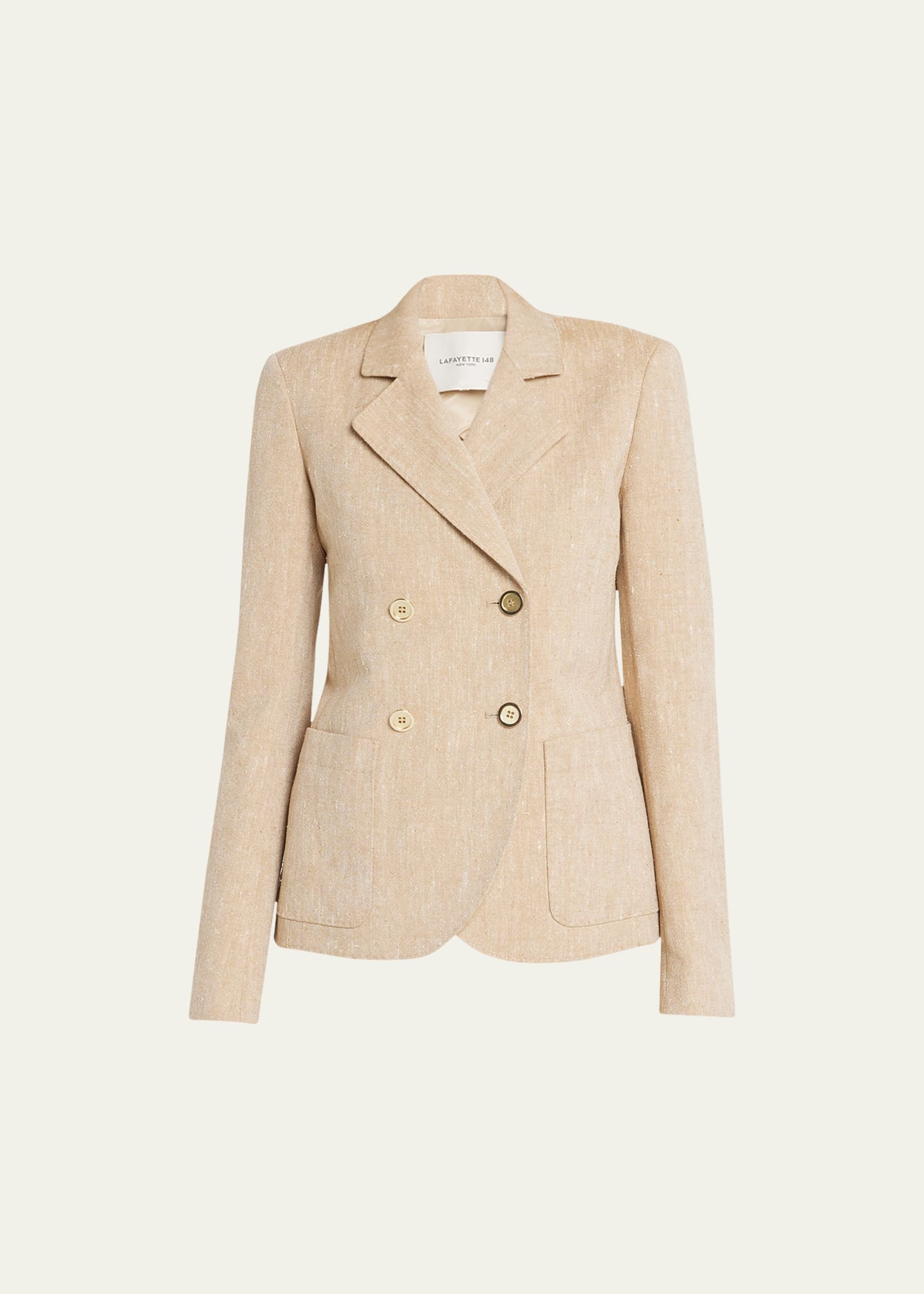 Lafayette 148 New York linen-silk blazer with pick stitch detailing Approx. 24"L from shoulders to hem Notched collar; double-breasted front Long sleeves; four-button cuffs Inside chest pocket Front patch pockets Rounded front hem Center back slit Relaxed fit Linen/silk Lining: Cotton/silk Dry clean Imported