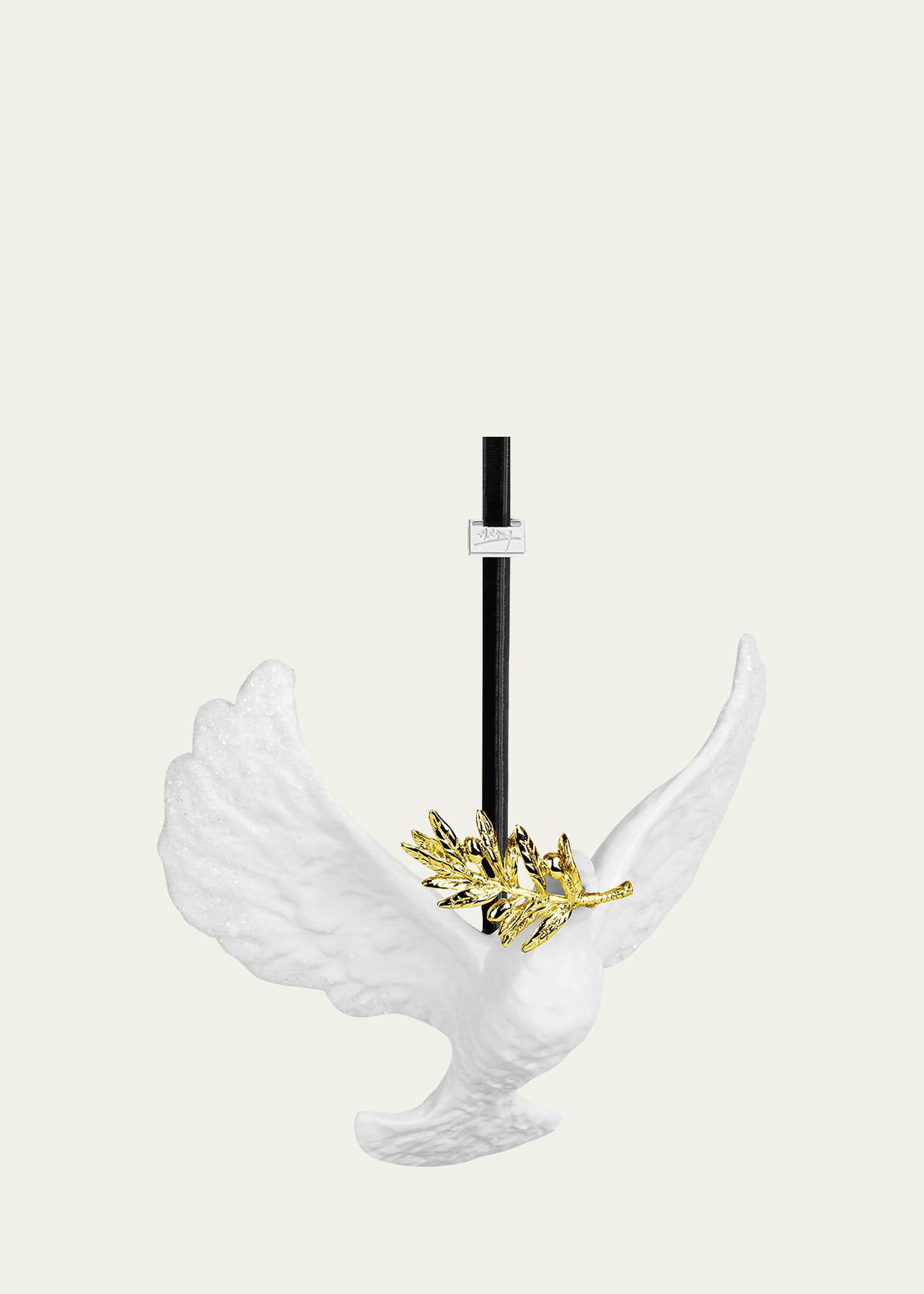Christmas ornament depicts dove holding an olive branch Crafted of silvertone metal Logo tag on hanging ribbon Approx. 4.5"W x 4.5"T Wipe clean Imported