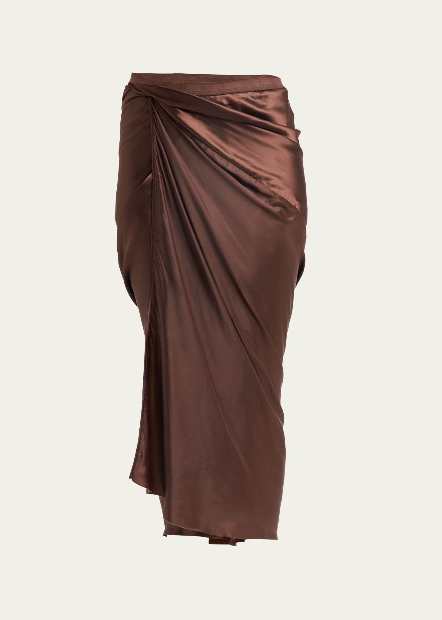 Rick Owens satin skirt with draped detail High waist Wrap silhouette Midi length Cupro Unlined Dry clean Made in Italy