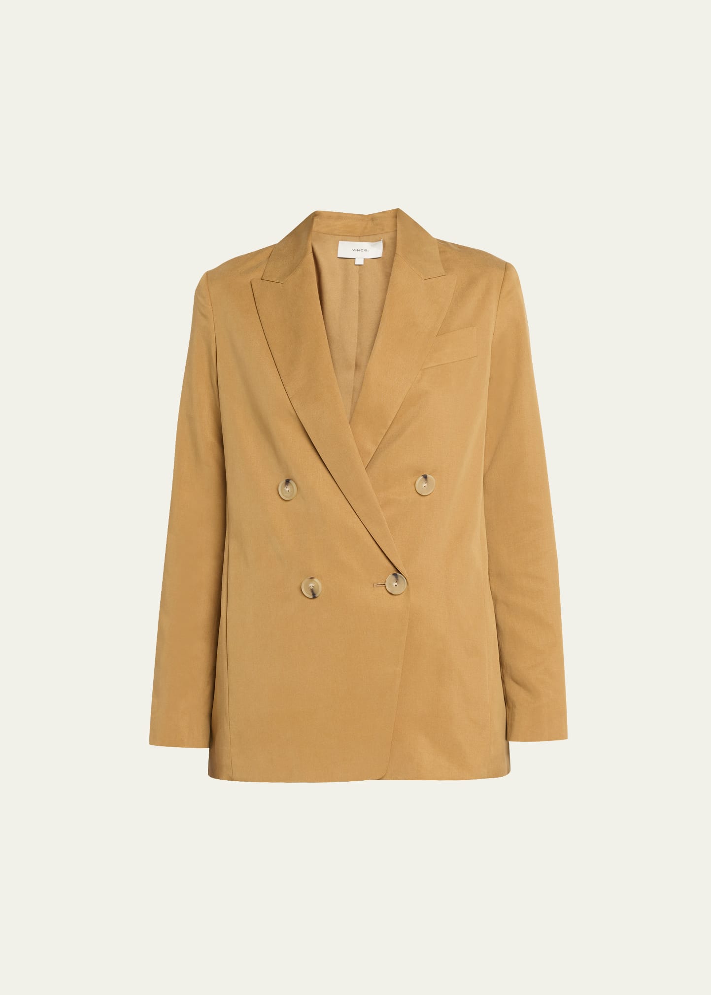 Vince drapey blazer Peak lapels; double-breasted front Long sleeves; button cuffs Chest welt pocket Cutaway front Back vent Oversized fit Hits below the hips Tencel® lyocell/nylon/polyamide Imported