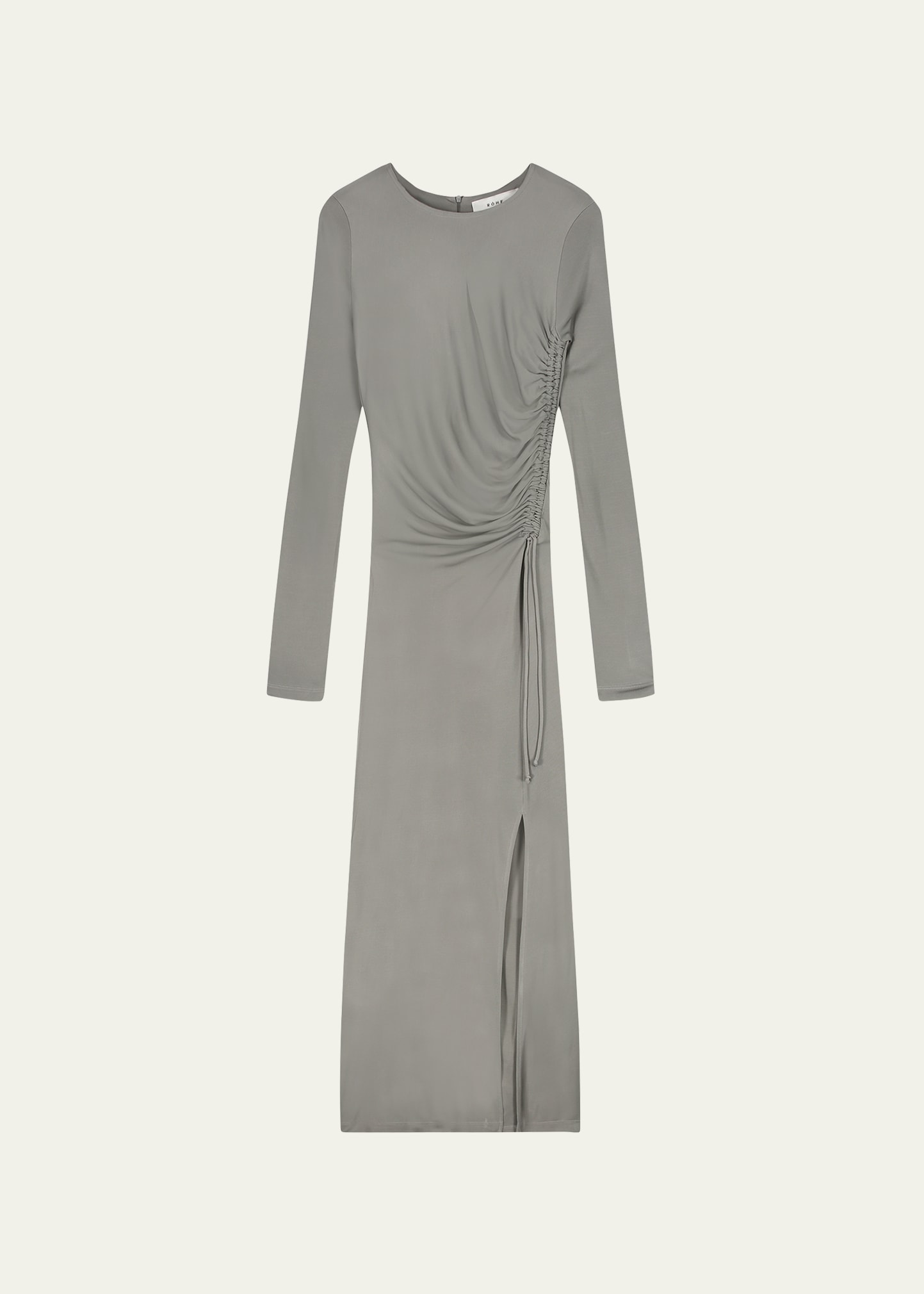Rohe jersey maxi dress with a drawstring gathering detail Crew neckline Long sleeves Bodycon fit Thigh-high slit Full length Back zipper Viscose Dry clean Imported