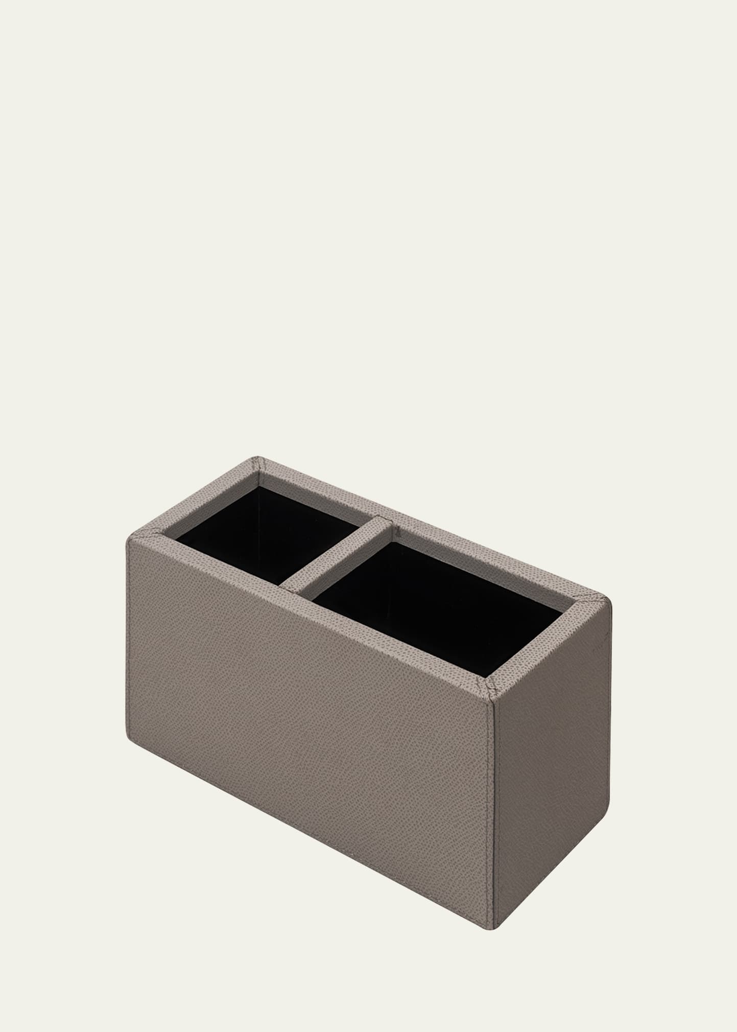 Pen holder made of wood composite and calf leather Approx. 7.4"L x 3.5"W Wipe clean with a sponge or cloth. Made in Italy Item Weight (Lbs.): 1.1