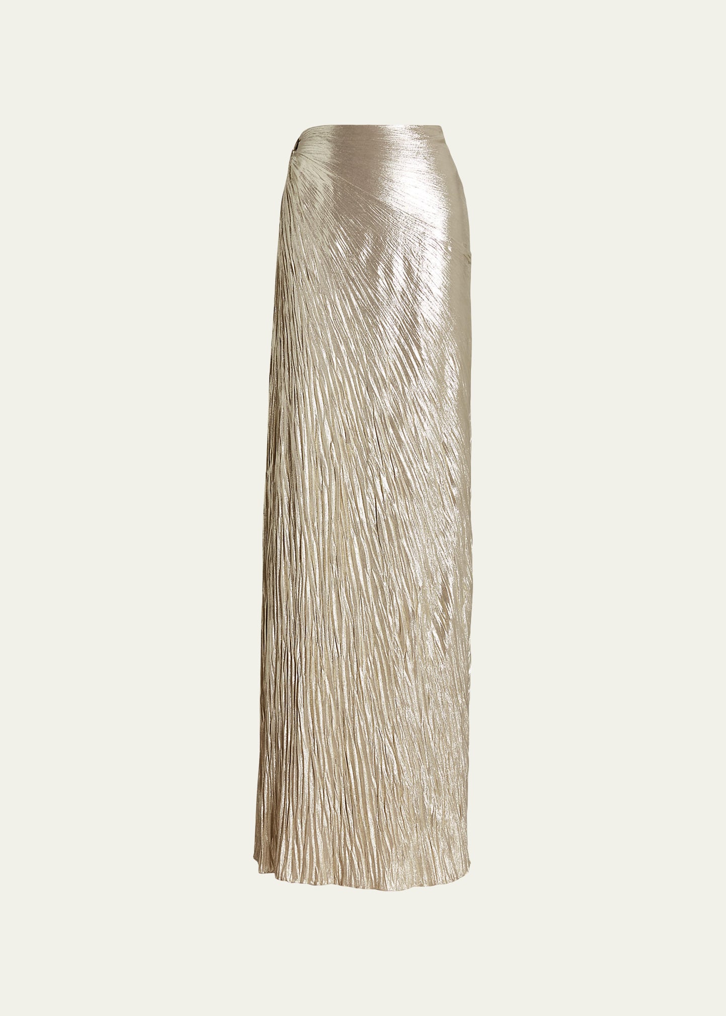 Ralph Lauren Collection "Duvall" metallic jersey plisse maxi skirt High rise Concealed side zip closure Full length A-line silhouette Viscose Made in Italy