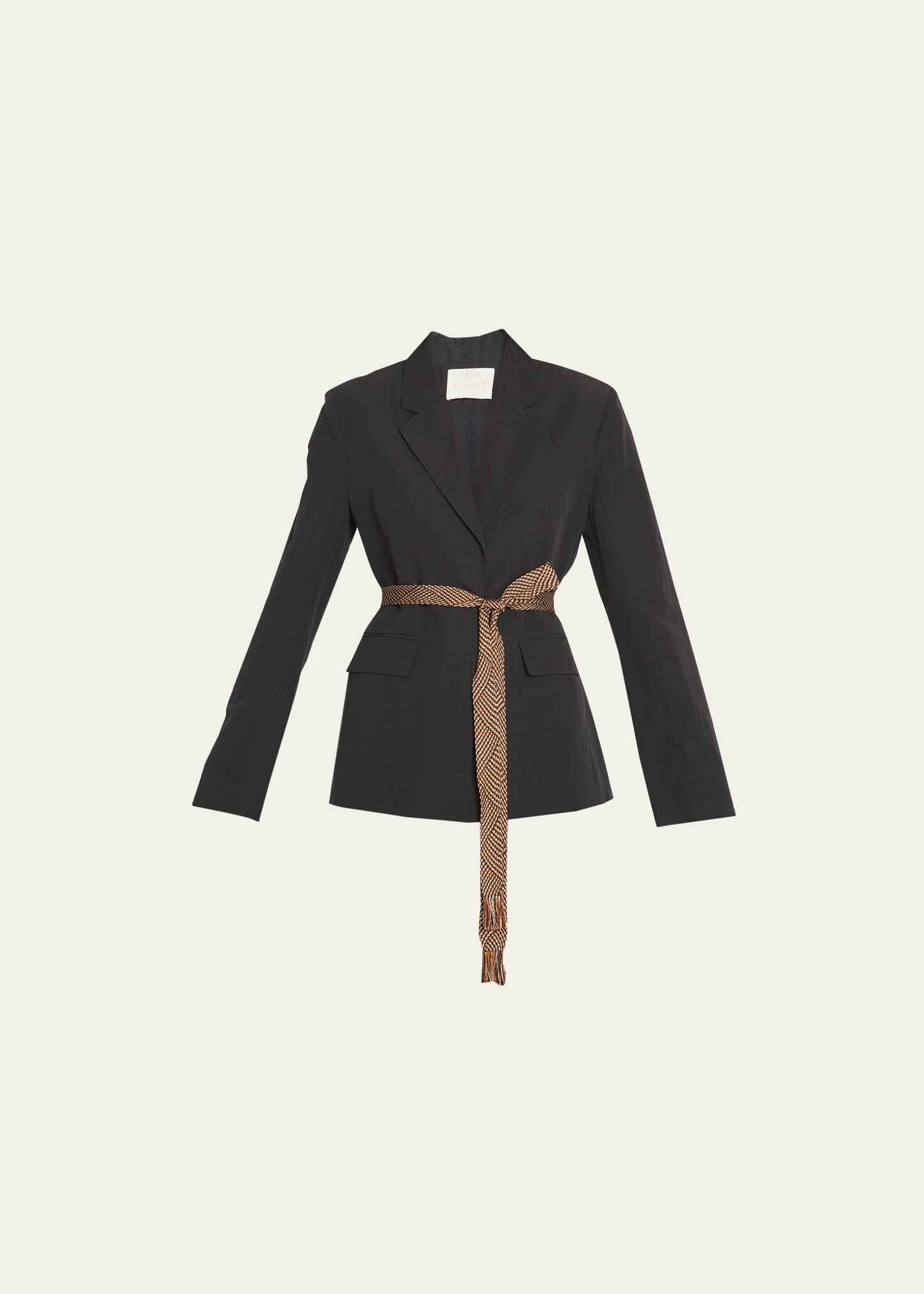 Ulla Johnson "Ellery" textured slub suiting jacket features a removable scarf belt with fringe trim Notched lapels; button front Long sleeves; button cuffs Front flap pockets Hits below the hips Cotton/linen Lining: Polyester Machine wash cold Imported