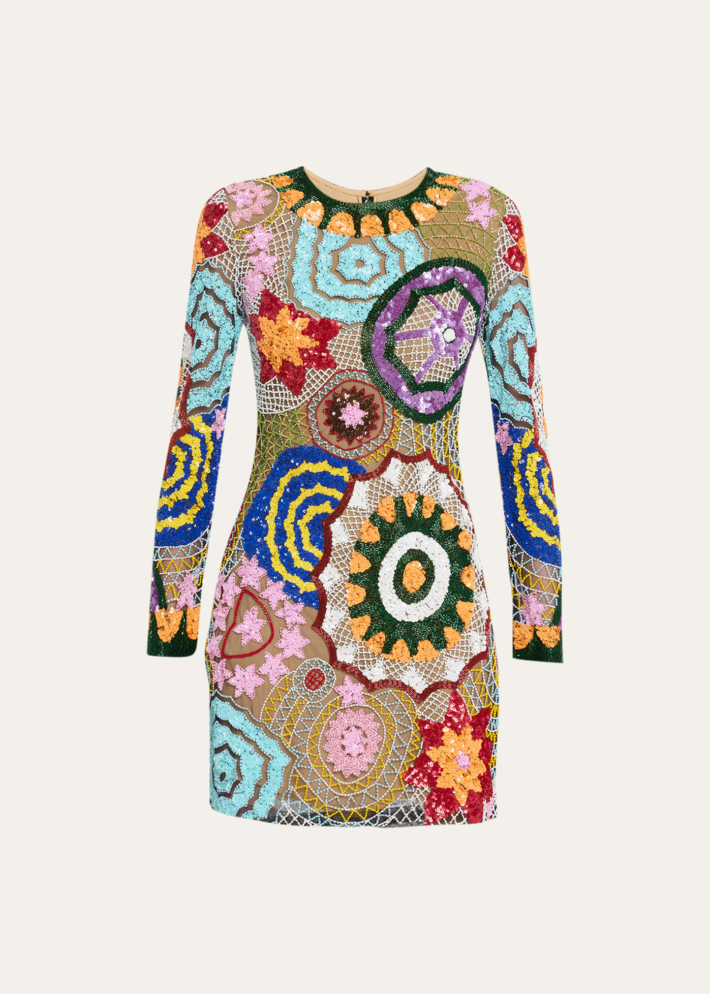 Naeem Khan cocktail dress features allover multicolor beaded details Round neckline Long sleeves Concealed back zip Hem falls above the knee Sheath silhouette Nylon/polyamide Lining: Silk Dry clean Trim: Beading Made in the USA from imported materials