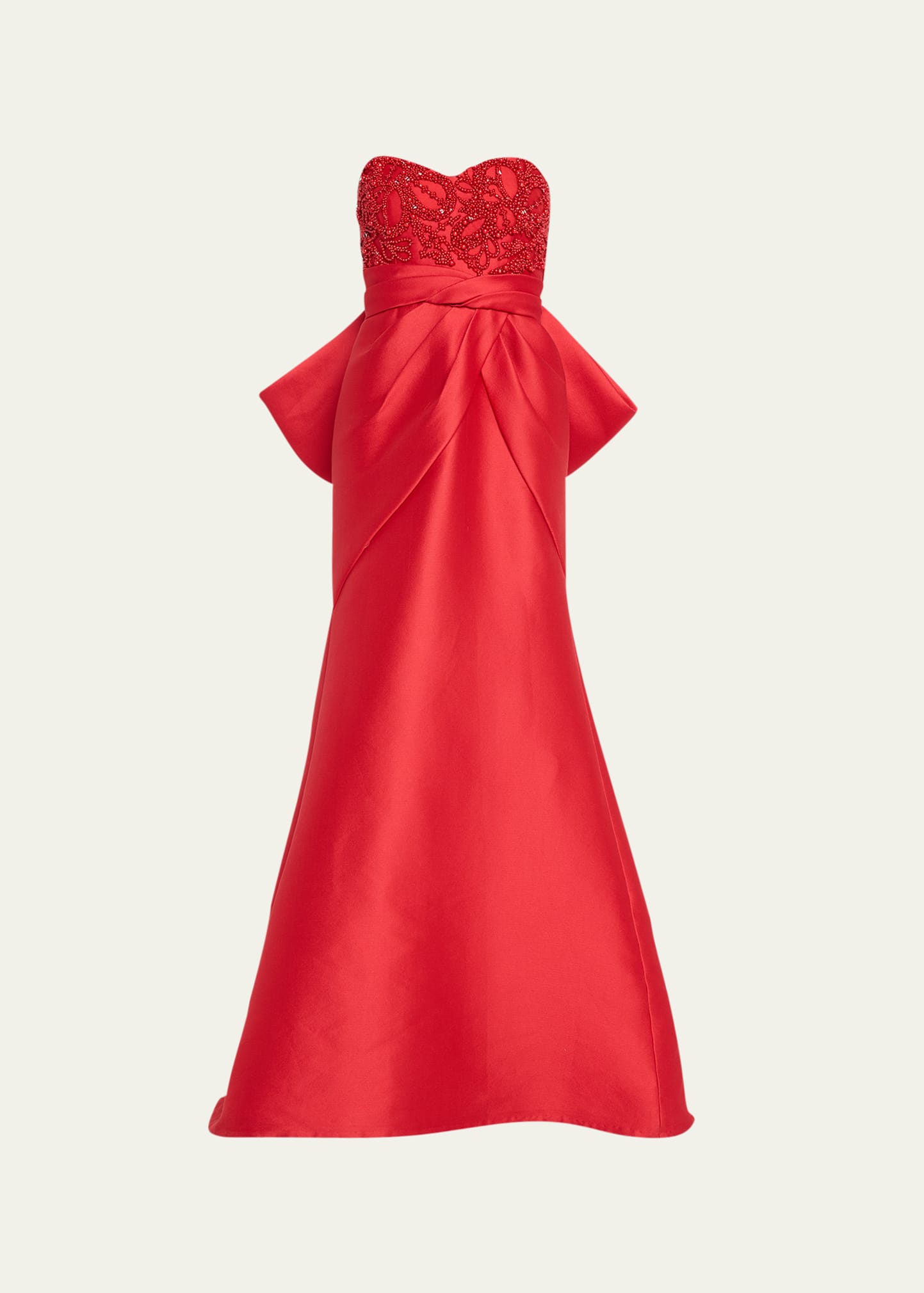 Pamella Roland pique Mikado gown features an embroidered bodice Sweetheart strapless neckline Sleeveless Trumpet silhouette Floor length Back zip Polyester self/lining Dry clean Made in USA from imported materials
