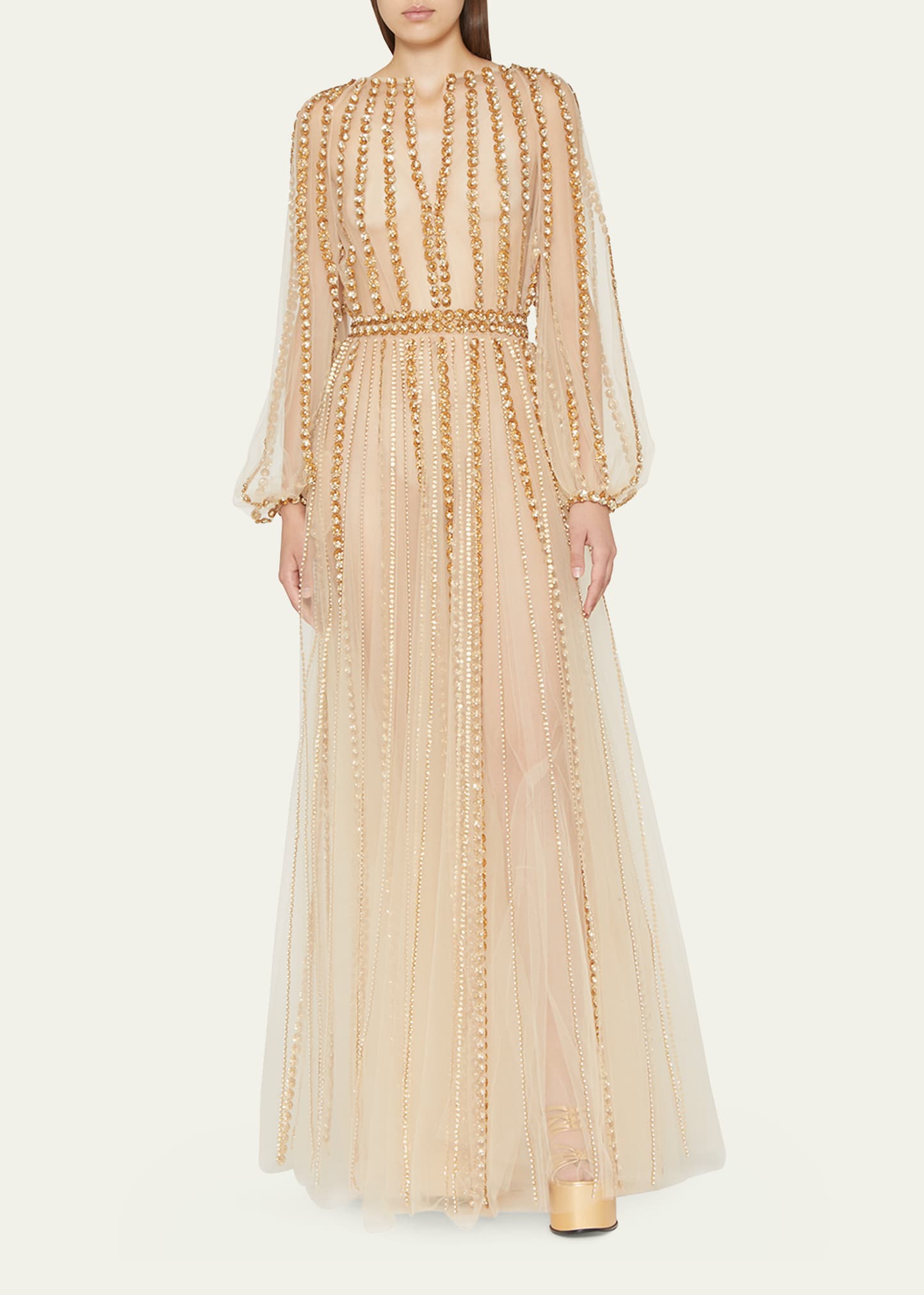 Valentino illusion gown with a tulle finish and sequin embroidery throughout V-neckline Long sleeves; balloon Banded waist Concealed back zip Floor length A-line silhouette Polyamide Made in Italy