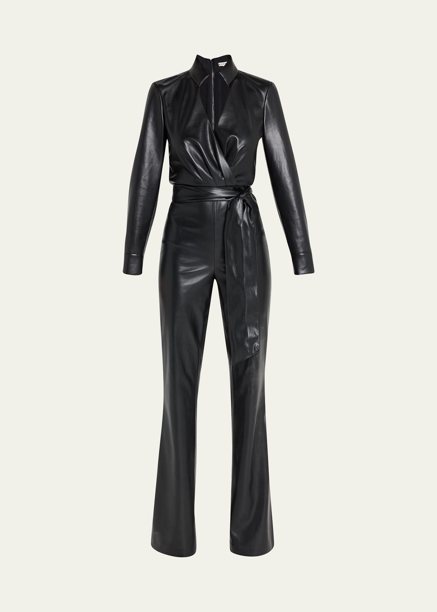 Alice + Olivia "Evita" smooth vegan leather (PU/polyester/elastane) jumpsuit Stand collar; surplice neckline Long sleeves; button cuffs Self-tie belt Full length Straight legs Exposed back zip Lining: Polyester Imported