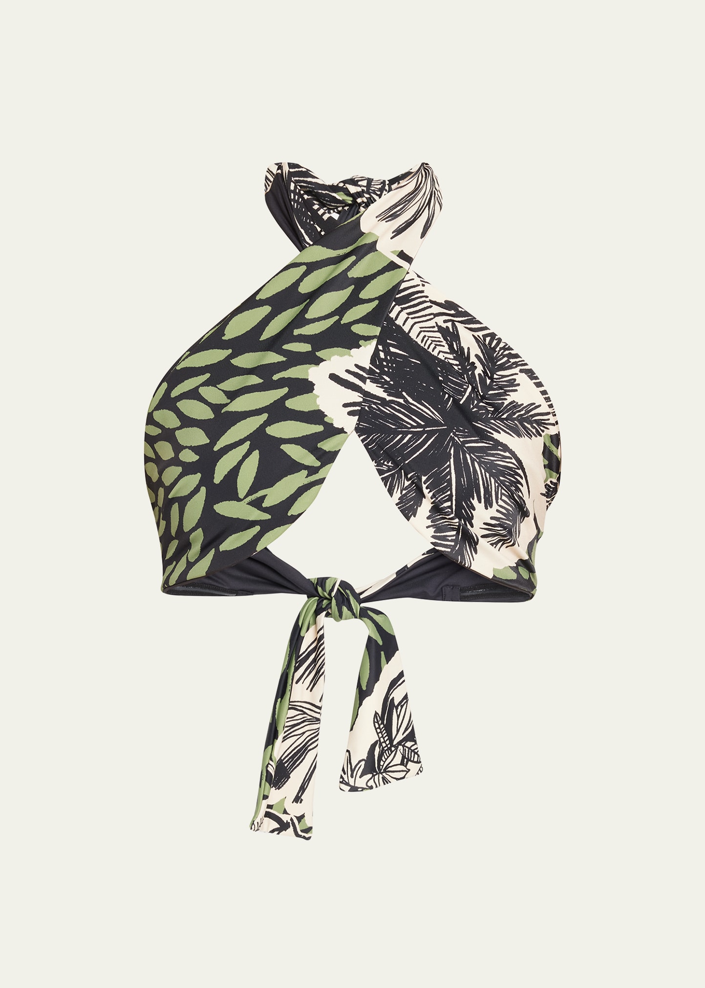 Johanna Ortiz "Expresión Africana" bikini top showcases a leafy print Crisscross halter neckline; soft ties behind the neck Open back Mid-back self-ties Polyamide/elastane Made in Colombia Bottoms sold separately