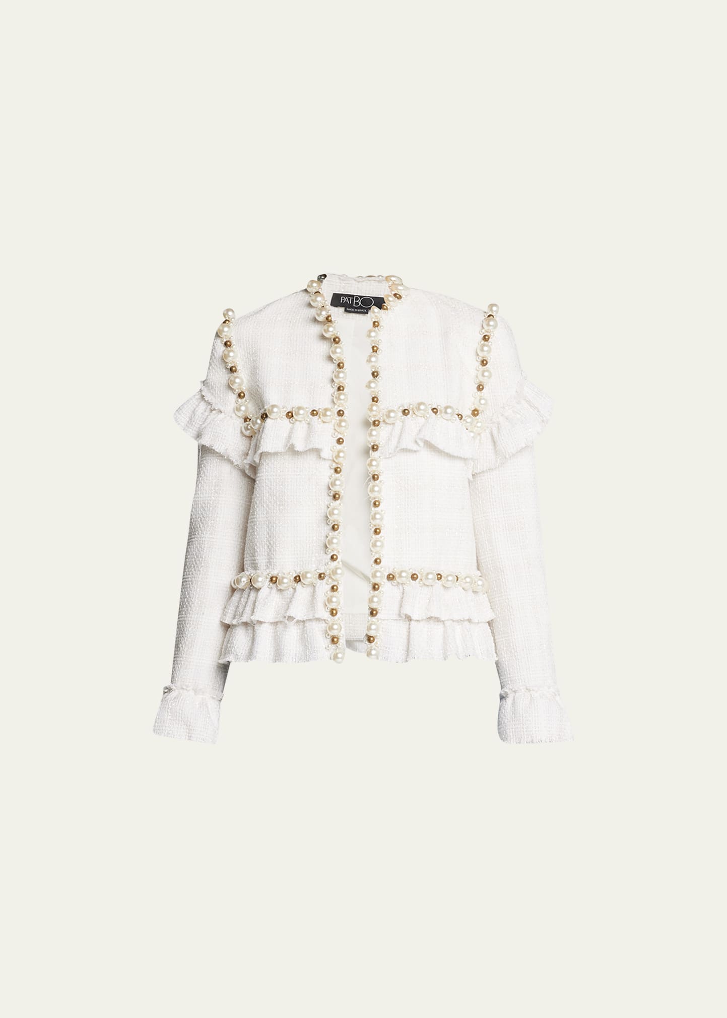PatBO tweed jacket embellished with faux pearls and ruffles Approx. 22"L from shoulder to hem Open front Long sleeves Relaxed fit Hip length Polyester/viscose/cotton Made in Brazil