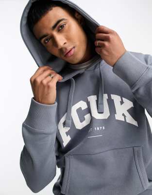 FCUK cracked print vintage logo hoodie in light blue & white