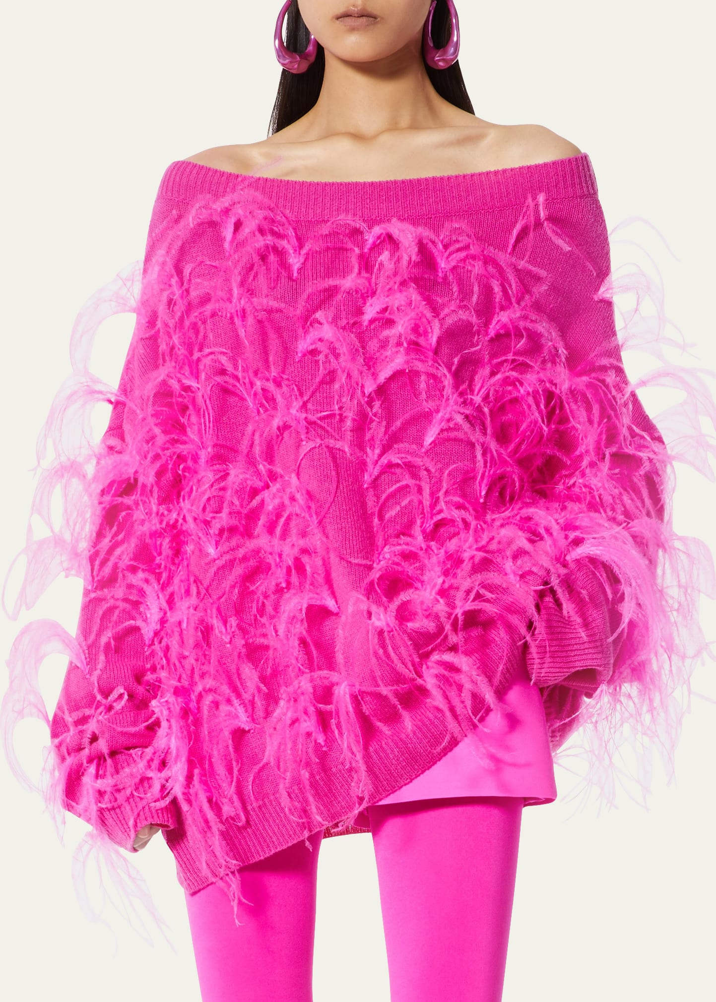 Valentino Garavani sweater embellished with ostrich (struthio camelus australis) and turkey (meleagris gallo pavo) feathers Off-the-shoulder neckline Long sleeves Oversized fit Ribbed cuffs and hem Pullover style Wool Made in Italy