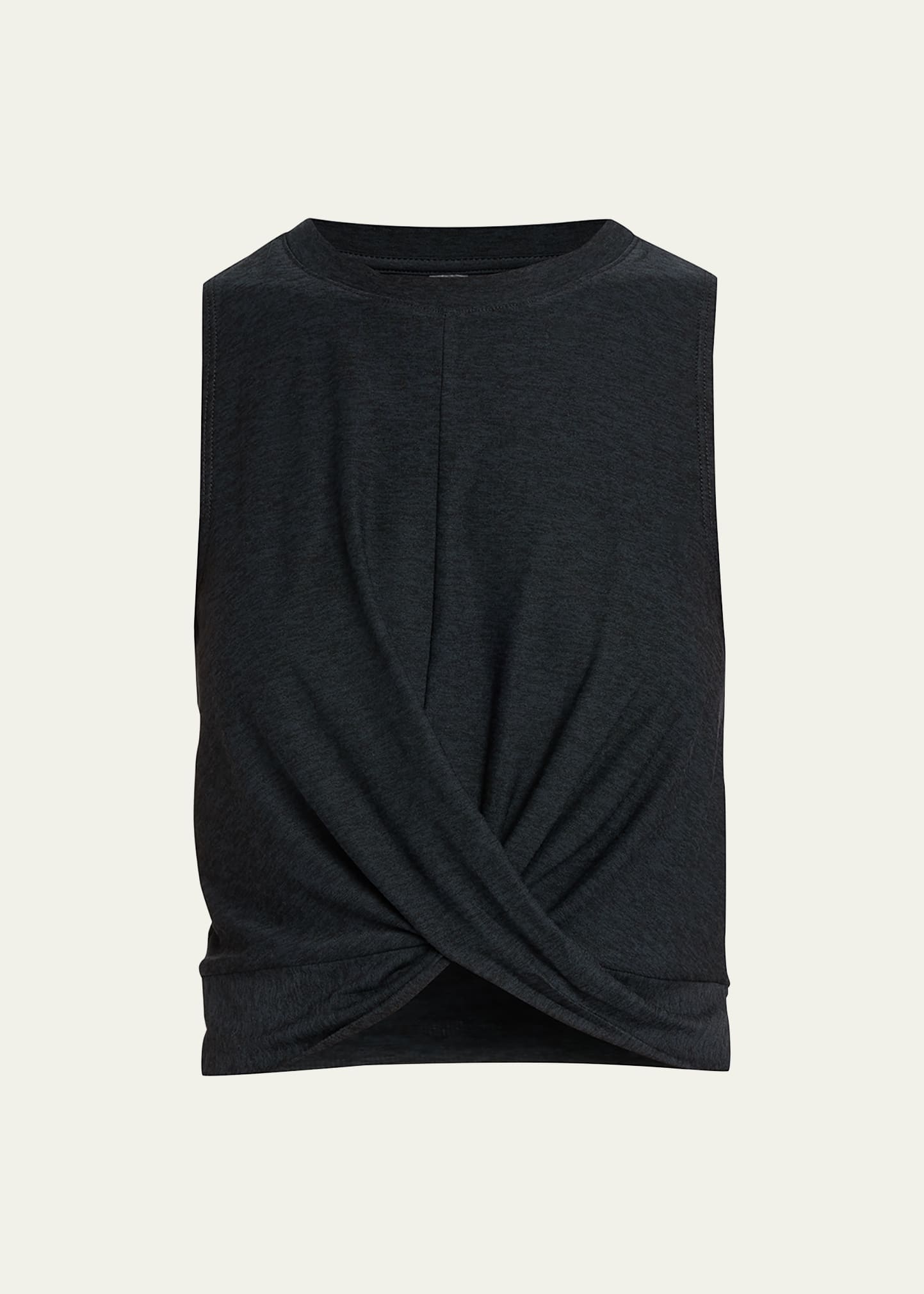 Beyond Yoga "Intersect" tank top crafted from signature Featherweight Spacedye fabric features a twisted hem Designed with four-way stretch, moisture-wicking, and UV protective properties Crew neckline Sleeveless Relaxed fit Slightly cropped hem Pullover style Polyester/spandex Made in USA