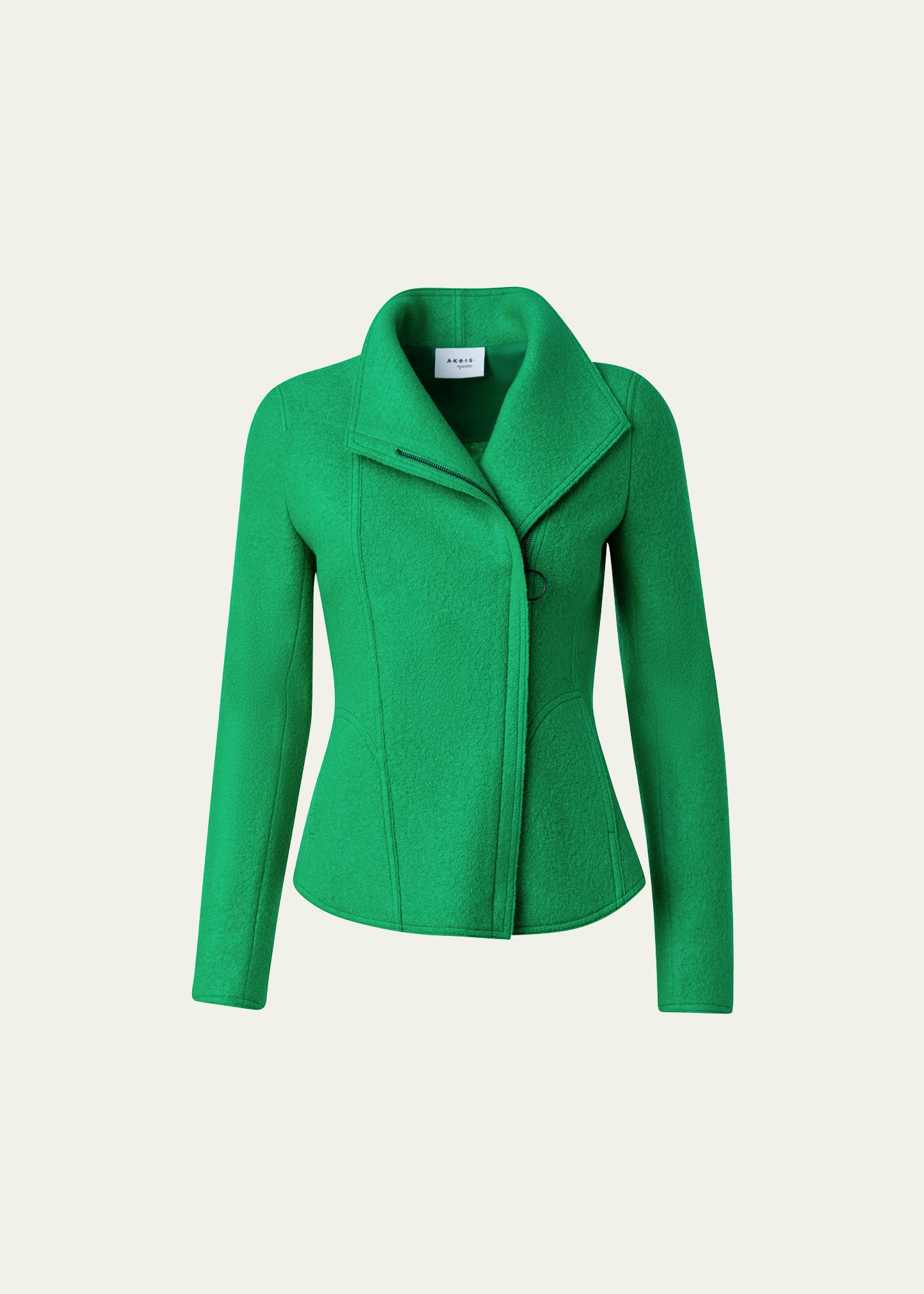 Akris punto felted wool biker jacket features an asymmetrical front zip closure Spread collar Long sleeves Side seam pockets Hip length Fitted silhouette Wool Made in Romania