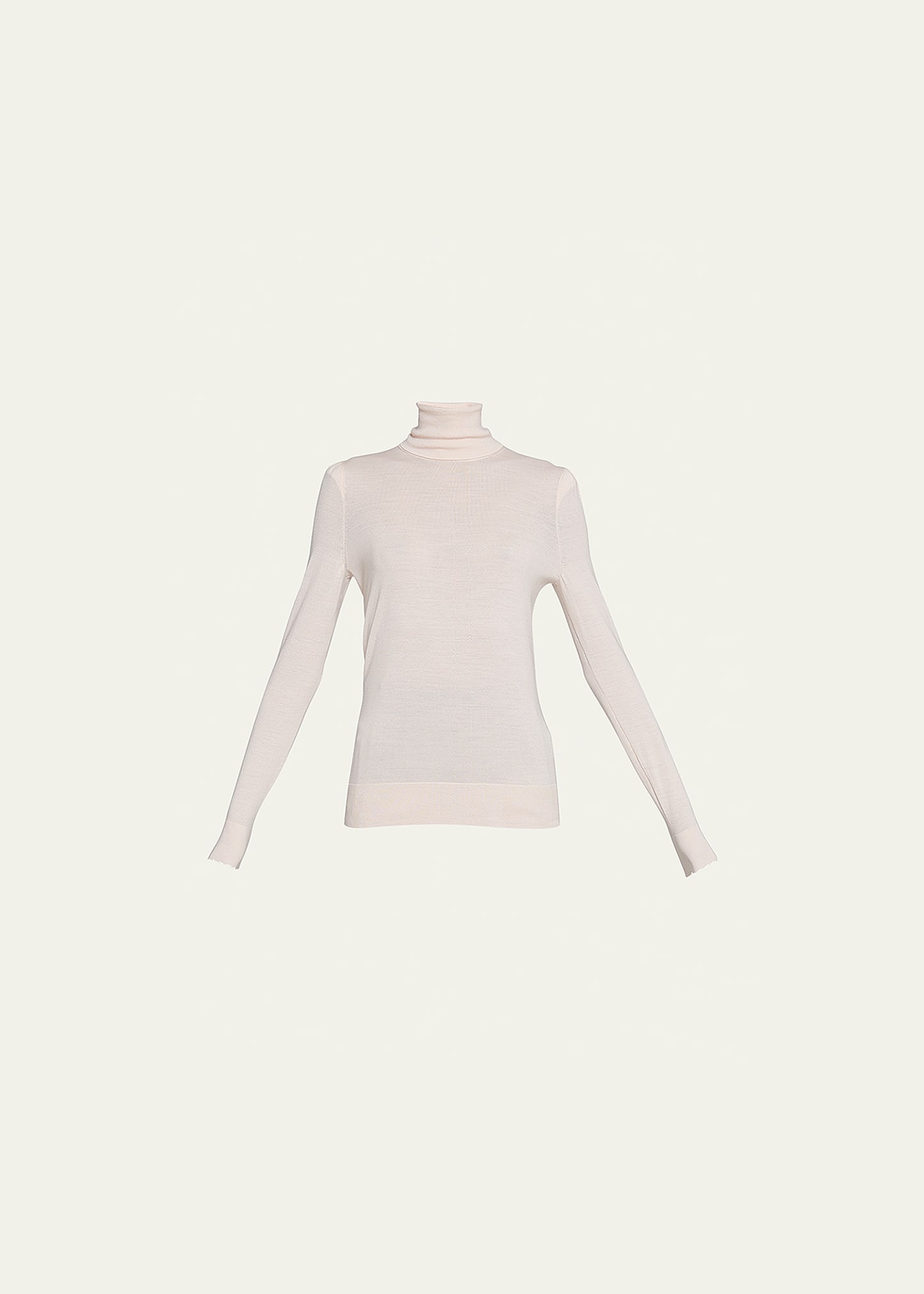 Chloe fine merino wool knit turtleneck Foldover collar Long sleeves Ribbed trim Hip length Pullover style Fitted Wool/polyamide/elastane Imported