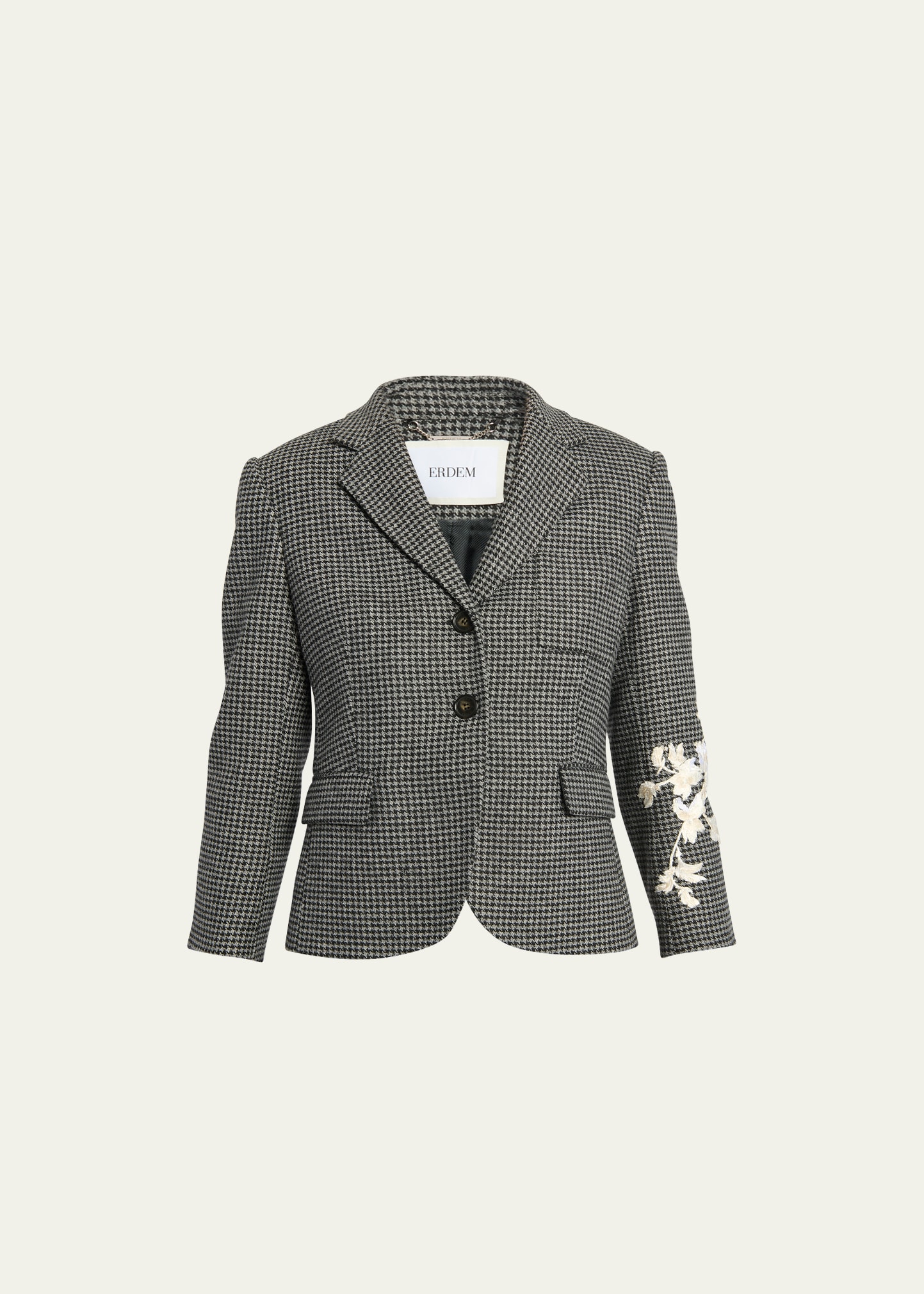 Erdem fitted blazer jacket features floral embroidered details at the sleeve Single breasted front Button front 3/4 sleeves; button cuffs Front flap pockets Hip length Tailored fit Wool/polyester/acrylic Lining: Cupro/acetate Dry clean, professional cleaning recommended Made in Romania