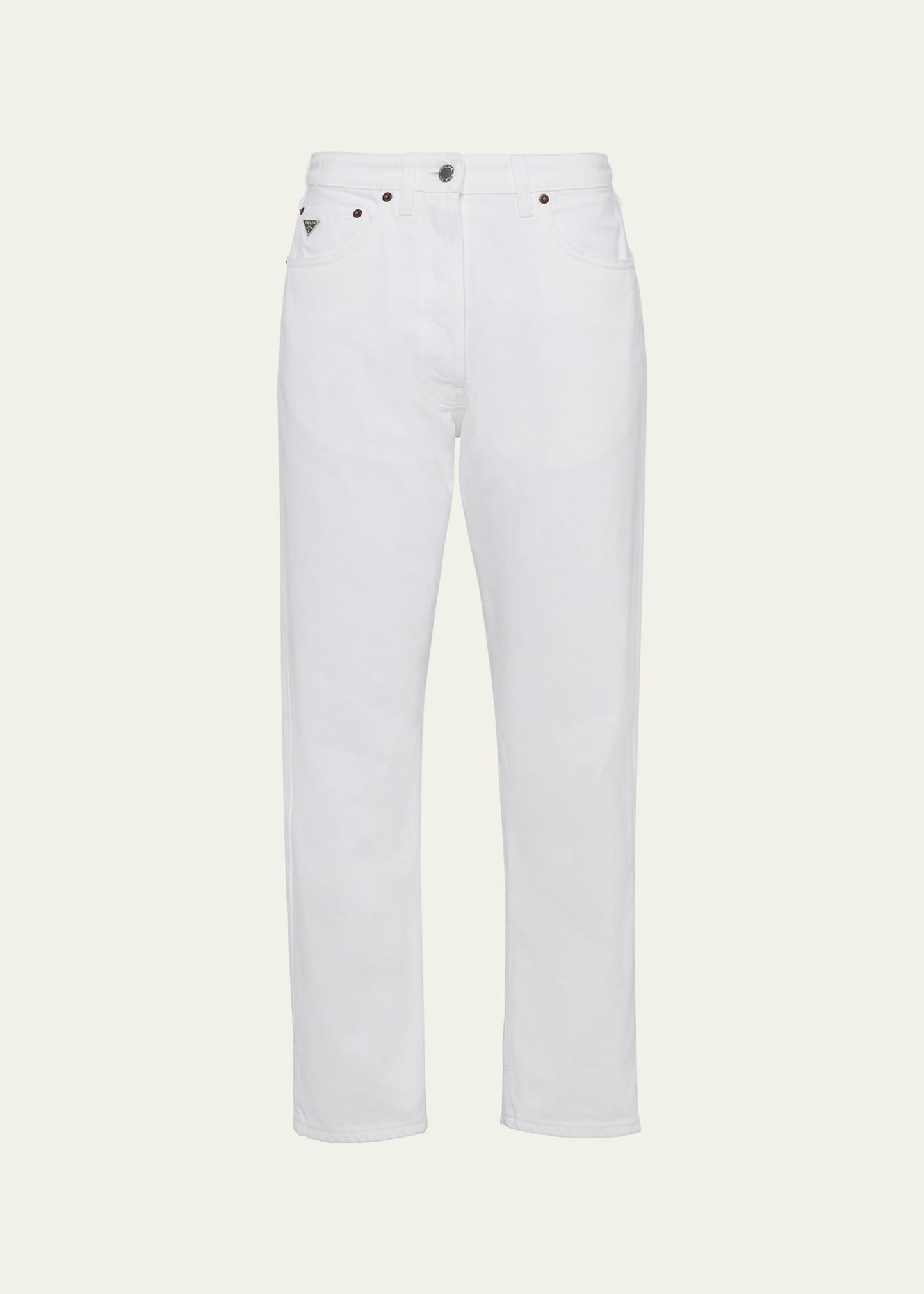 Prada bull denim pants with enameled metal triangle logo High waist Five-pocket style Straight legs Cropped fit Button/zip fly; belt loops Cotton Dry clean, professional cleaning recommended Made in Italy