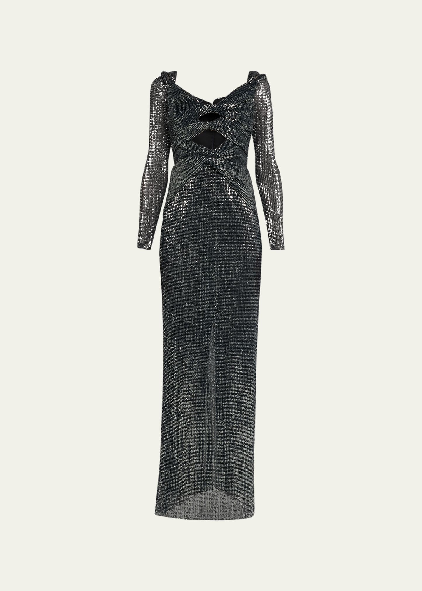 Altuzarra "Flakonera" off-shoulder gown features an allover metallic embellished finish and front cutouts Sweetheart neckline Long sleeves Concealed back zip Full length Column silhouette Polyester Made in Italy