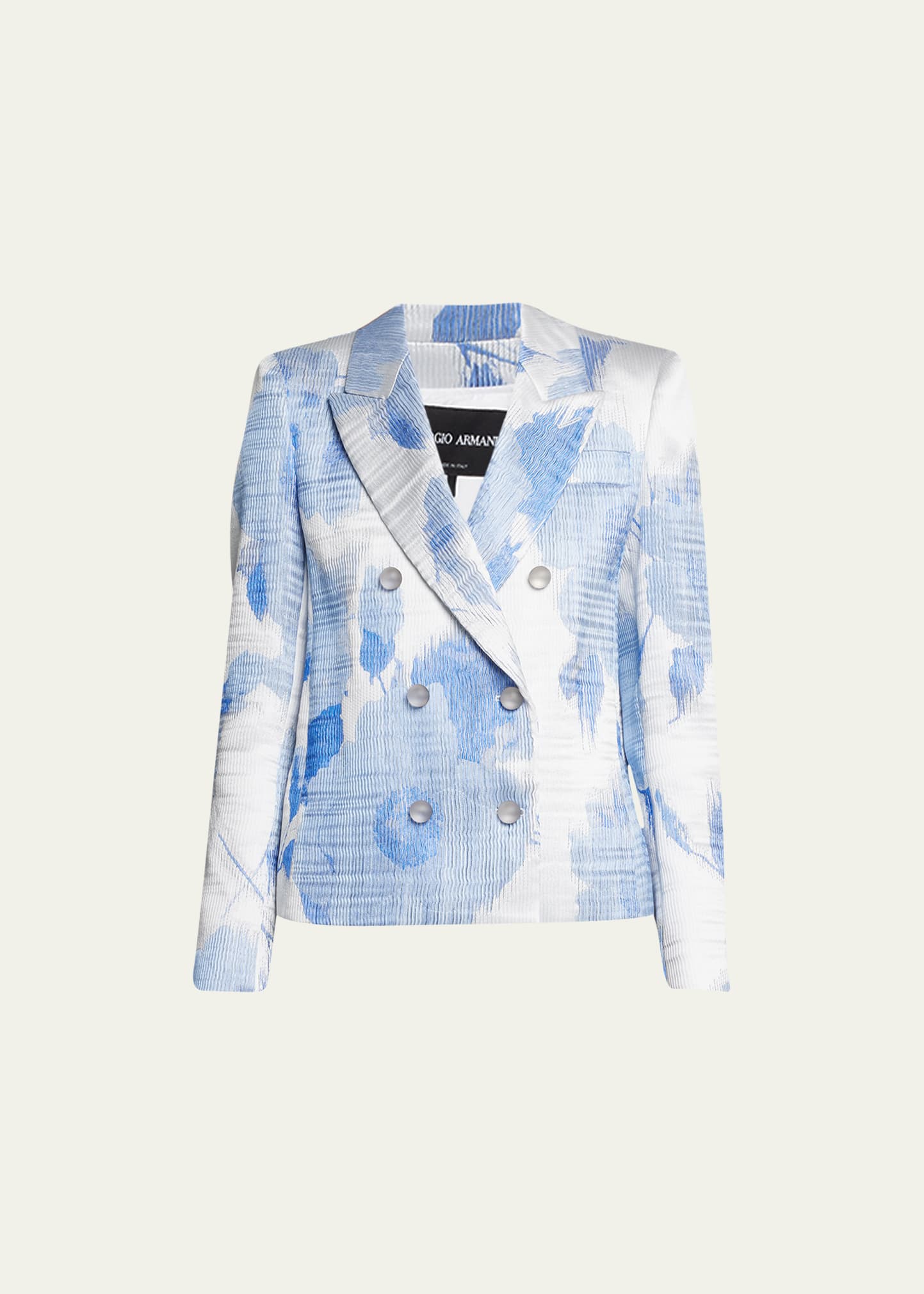 Giorgio Armani blazer jacket in floral jacquard Peak lapels; double-breasted front Long sleeves; button cuffs Chest welt pocket Tailored fit Silk Dry clean Made in Italy