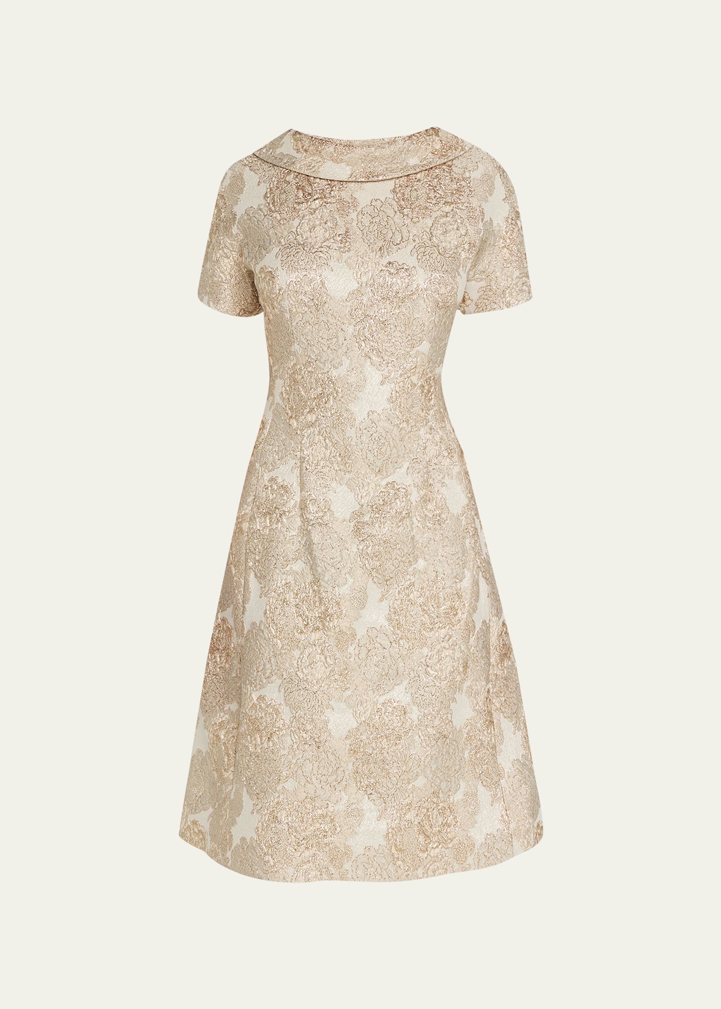 Rickie Freeman for Teri Jon midi dress crafted from metallic floral jacquard High foldover neckline Short sleeves Waist-defining princess seams Hem falls above the knee Fit-&-flare silhouette Invisible back zipper Polyester/cotton/metallic Lining: Polyester Imported