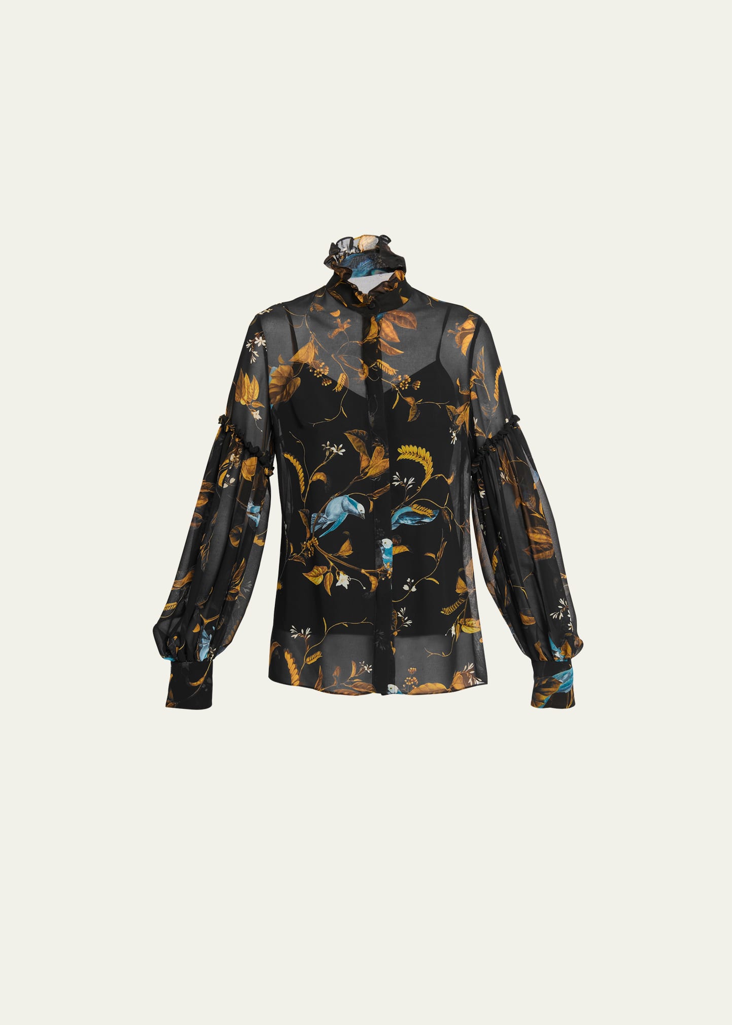 Erdem floral print blouse features ruffle details and a semi-sheer finish High neckline Button front Long sleeves; volume style Mid-length Relaxed fit Silk Dry clean, professional cleaning recommended Made in Poland