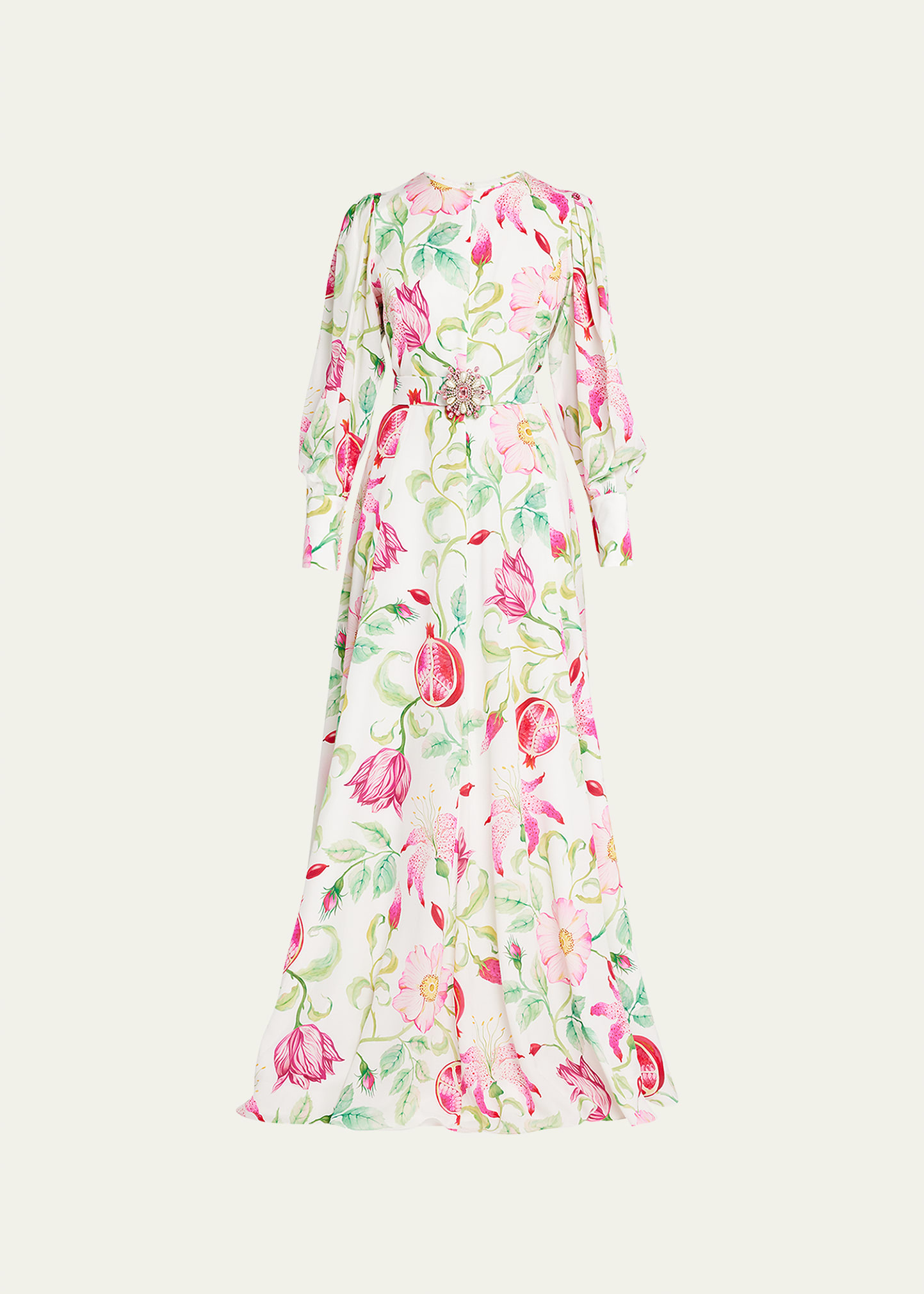 Andrew Gn gown in floral print with a crystal-embellished belt Jewel neckline Long puff sleeves; button cuffs Removable buckle belt A-line silhouette Floor sweeping hem Back zip Silk Polyester/viscose lining Made in Italy