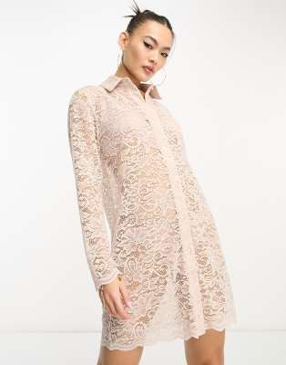 Flounce London lace mini shirt dress with scallop edge in taupe-Neutral