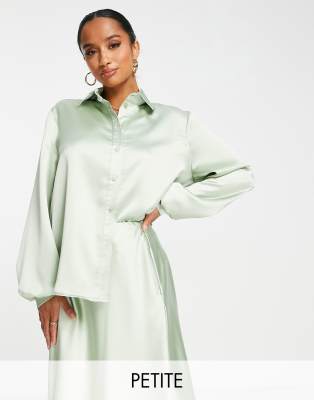 Flounce London Petite satin button up oversized shirt in sage - part of a set-Green