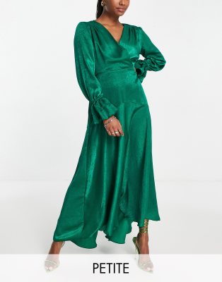 Flounce London Petite satin long sleeve midi dress in emerald-Green