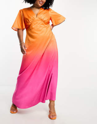 Flounce London Plus flutter sleeve maxi dress with plunge front in ombre pink and orange-Multi
