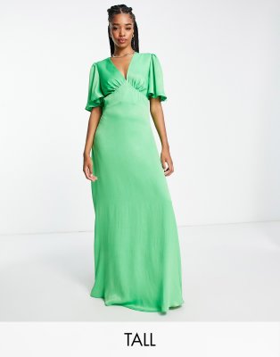 Flounce London Tall satin flutter sleeve maxi dress with plunge front in bold green