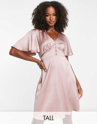 Flounce London Tall satin flutter sleeve mini dress in heather rose-Pink