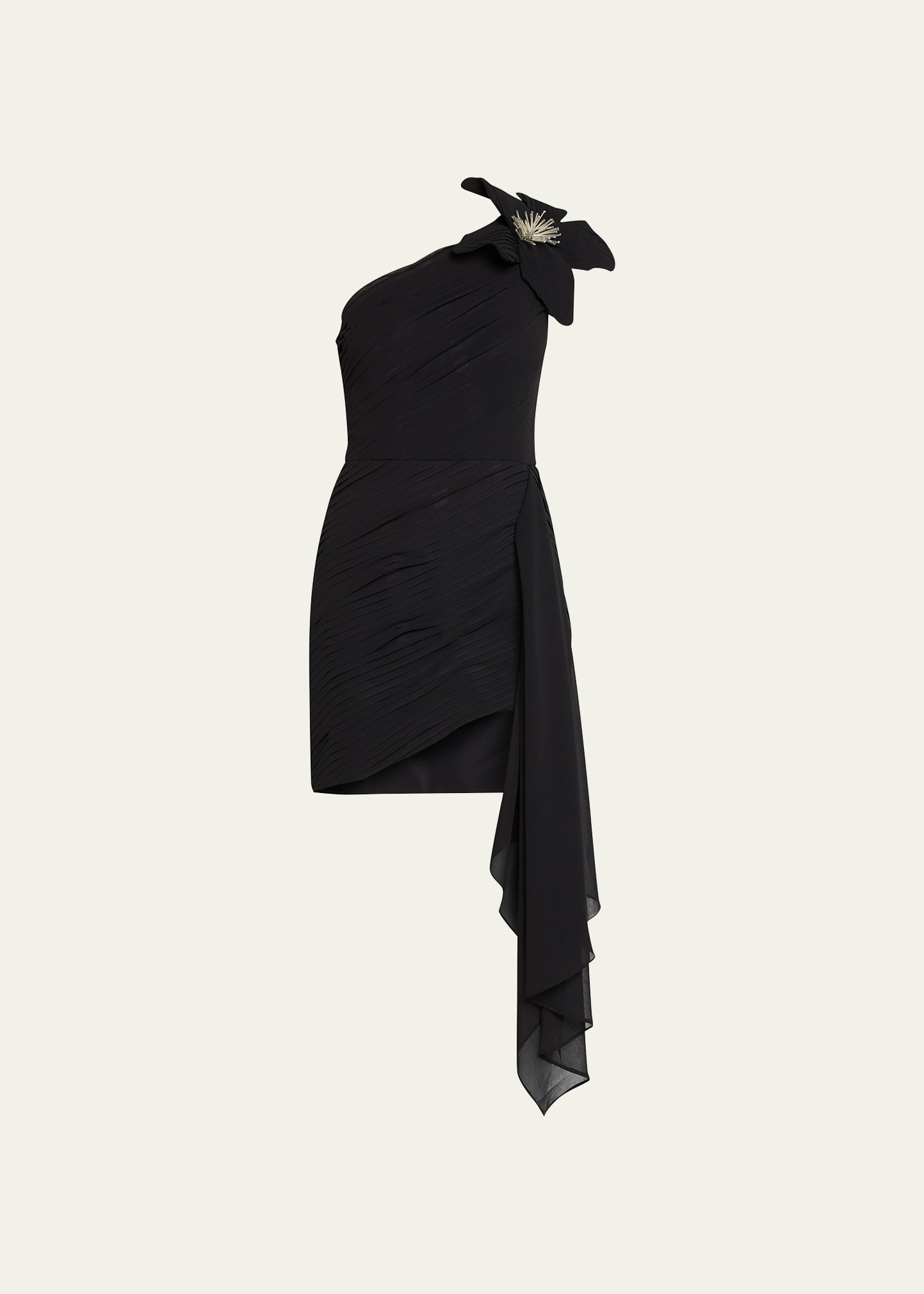 PatBO pintuck party dress featuring a flower appliqué Approx. 32"L from shoulder to hem One-shoulder neckline Sleeveless Fitted skirt with side drape Mini length A-line silhouette Concealed side zipper Polyester Lining: Polyester Dry clean, machine wash cold Made in Brazil