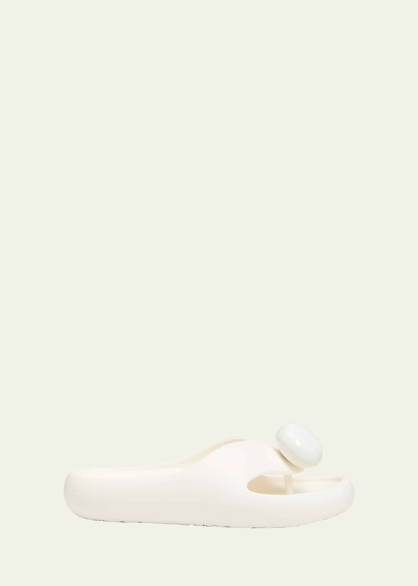 Loewe "Bubble" rubber cruise sandals with logo medallion accent Chunky flat heel Thong strap Slide style Molded comfort footbed Rubber sole Made in Italy