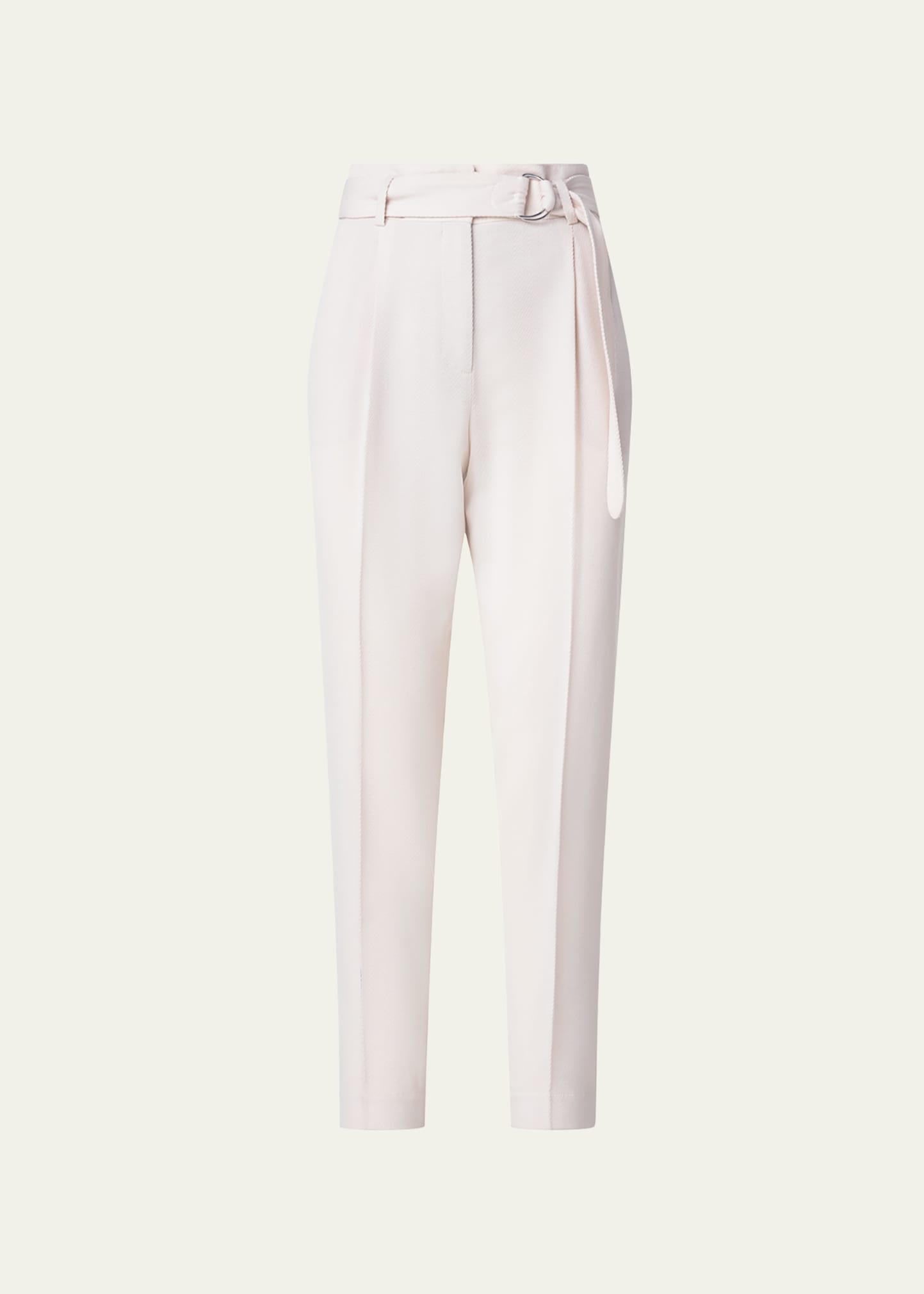 Akris punto "Fred" belted trouser pants in virgin wool High rise Pleated front Button/zip fly; belt loops Adjustable belt; D-ring closure Side slip pockets; back welt pocket Straight legs Full length Relaxed fit Virgin wool Made in Romania