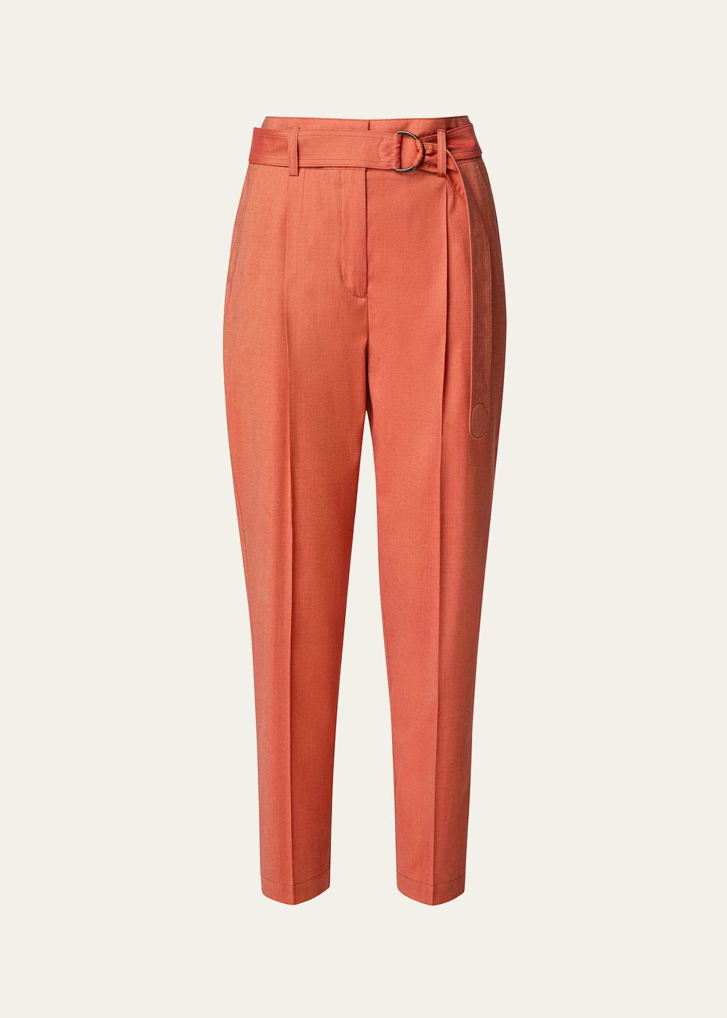 Akris punto "Fred" wool blend pants with an included D-ring belt Mid-rise Pleated front Button/zip fly; belt loops Side slip pockets; back welt pocket Tapered legs Cropped at the ankle Virgin wool/viscose/spandex Lining: Cupro Made in Romania