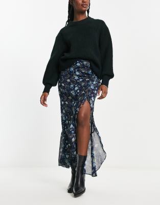 Free People tie-side detail floral print boho maxi skirt in ink blue-Navy