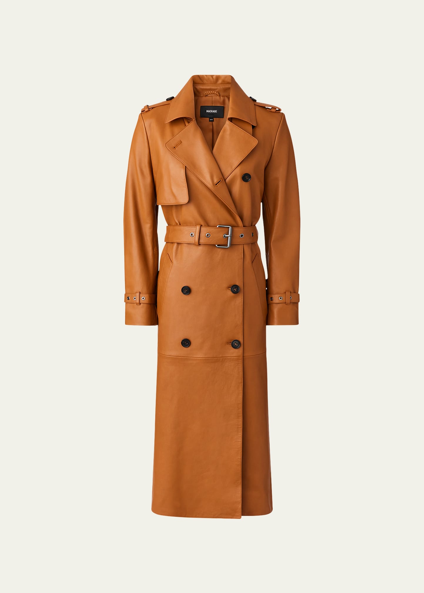A timeless piece with standout style, Mackage "Gael" trench coat is crafted from signature (r) leather and is perfect for year-round layering Wide notched Napoleon lapels; double-breasted front Epaulet shoulders Long sleeves; adjustable belted cuffs Asymmetrical rainshed Removable belt through belt loops Slanted welt waist pockets Hem falls below the knee Relaxed fit Vented back Leather Lining: Polyester Dry clean Imported