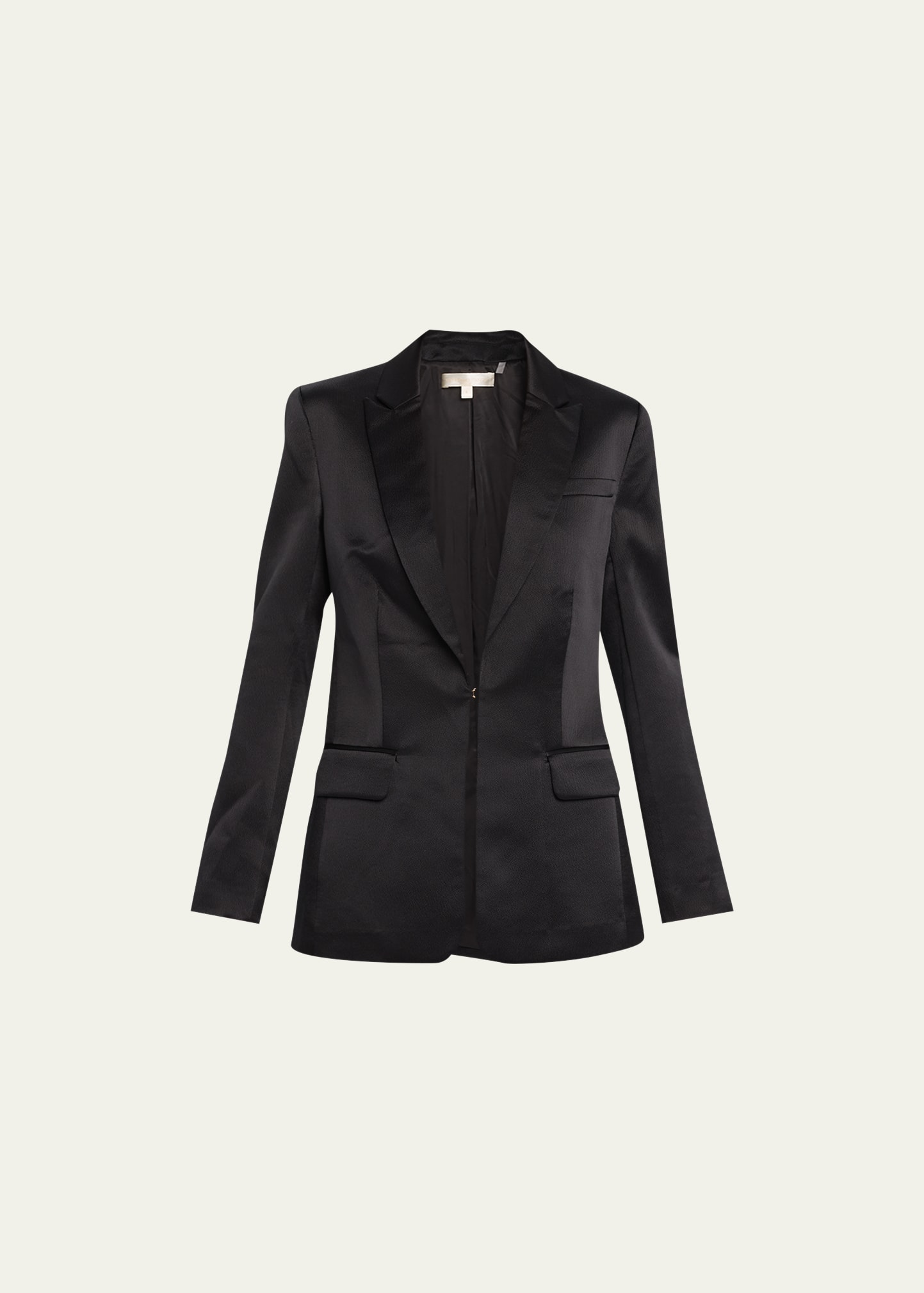 LoveShackFancy "Gason" sleek satin blazer Approx. 28.8"L from shoulder to hem Peak lapels; front hook closure Long sleeves Hip flap pockets Back vent Tailored fit Hits below the hips Silk Lining: Polyester Dry clean Imported