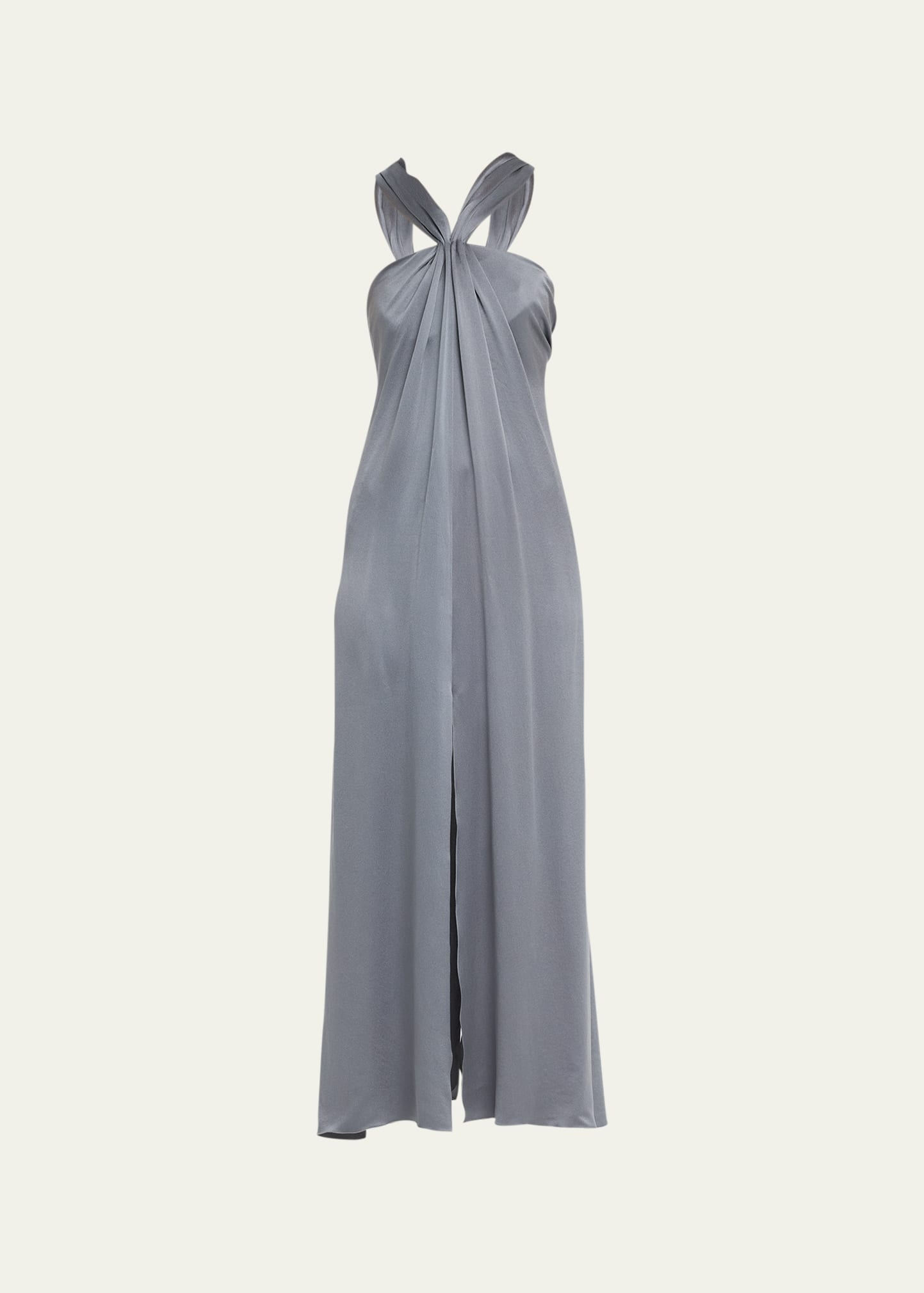 Giorgio Armani gown featuring gathered neck detail Halter neckline Sleeveless A-line silhouette Full length Center-front and back slit hem Invisible back zip Silk Dry clean Made in Italy