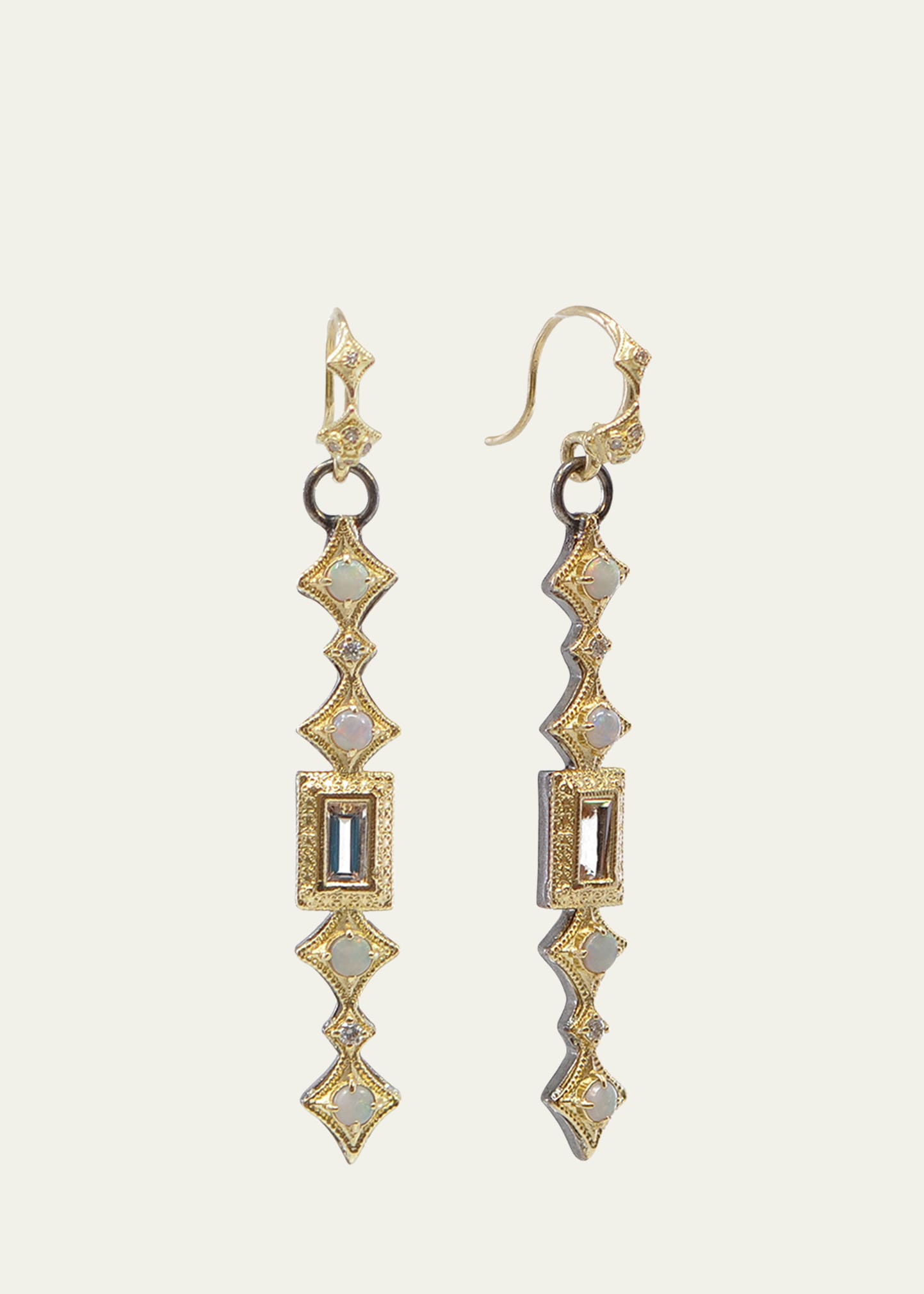 Armenta earrings 18-karat solid yellow gold and sterling silver 14 round white crivelli diamonds Total diamond carat weight: 0.129 Baguette morganite and round white opal Wire backs for pierced ears Spot clean Made in USA