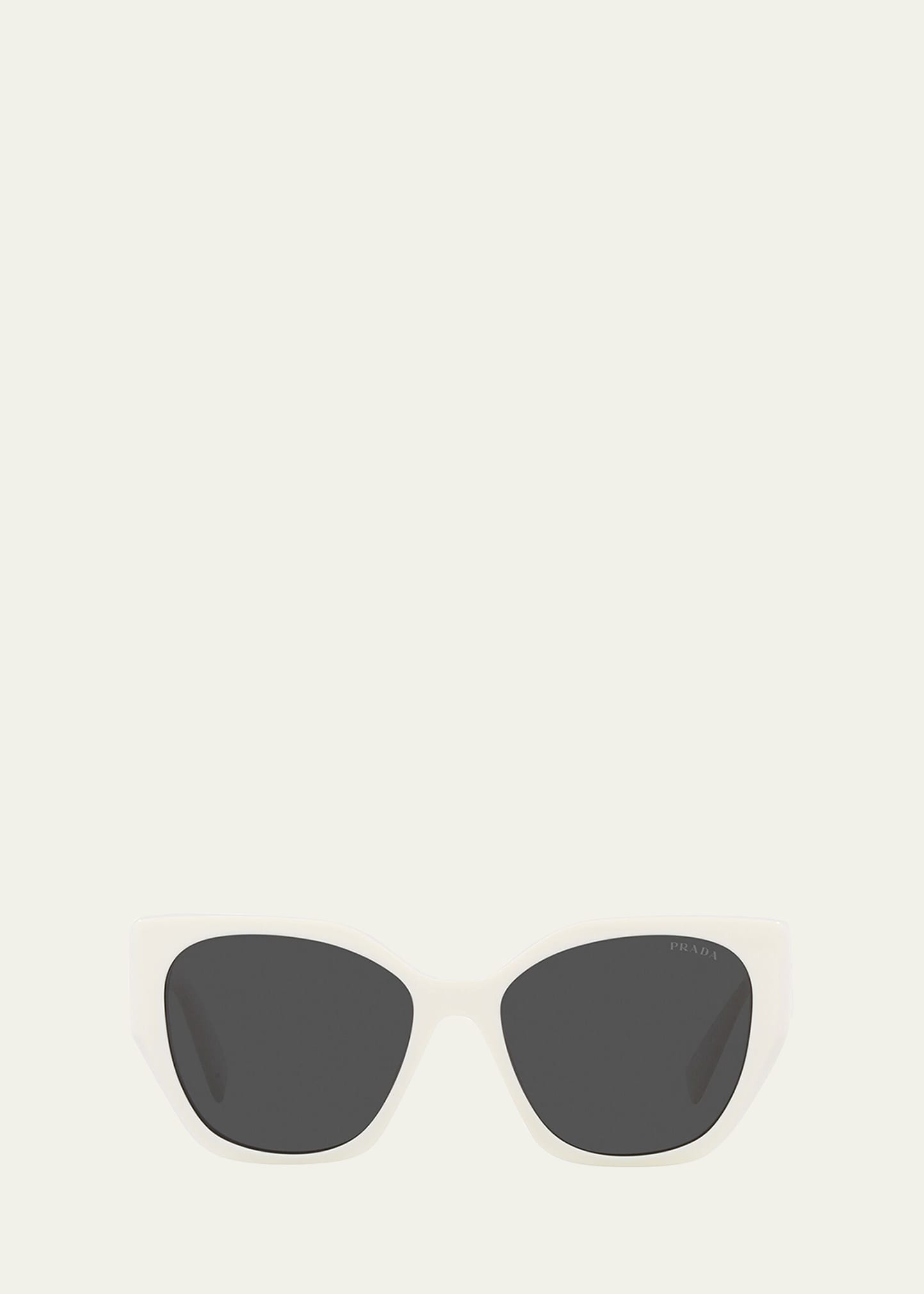 Prada square sunglasses in acetate and plastic Lens/bridge/temple (in mm): 55-17-145 Solid lenses; logo on corner Saddle nose bridge Logo detail on temples Geometric, tapered arms Style is Rx-able 100% UVA/UVB protection Made in Italy